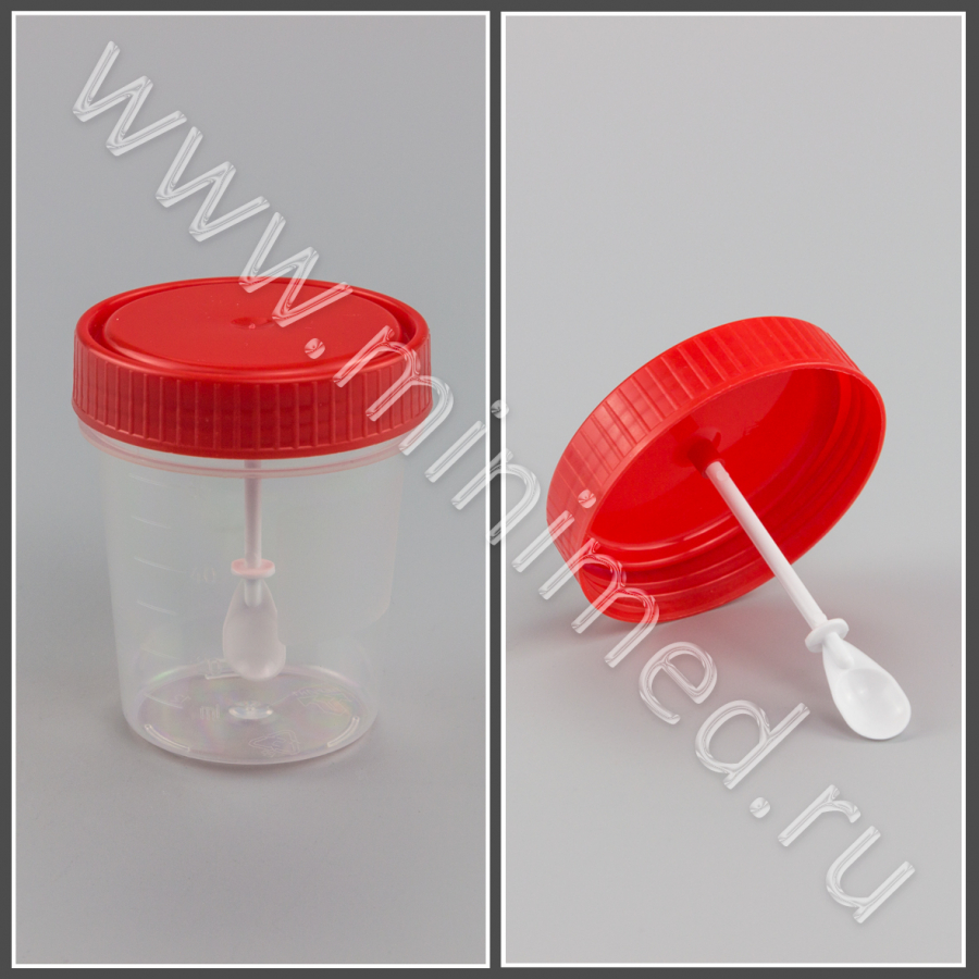Контейнер одноразовый медицинский полимерный КО0НЛПП-60 с ложкой и красной крышкой , н/ст ПЕРИНТ, уп.500 шт