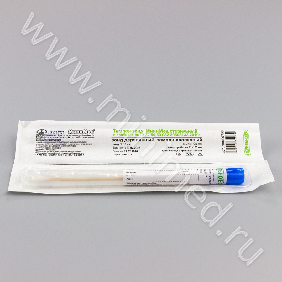 Предназначен для взятия и хранения образцов биологического материала с целью безопасной транспортировки в лабораторию для проведения анализа. Удобен для взятия смывов, в том числе санитарных. Стерильный. Тампон-зонд упакован в ударопрочную ПП-пробирку (12*155 мм). Пробирка снабжена этикеткой, на которой указаны: номер партии, дата стерилизации, срок годности, компания-производитель, компания-поставщик, регистрационное удостоверение, а также предусматривает место для нанесения сведений о пациенте и пробе. Край этикетки скреплен с пробкой, закрывающей пробирку с тампоном - этикетка служит контролем первого вскрытия.