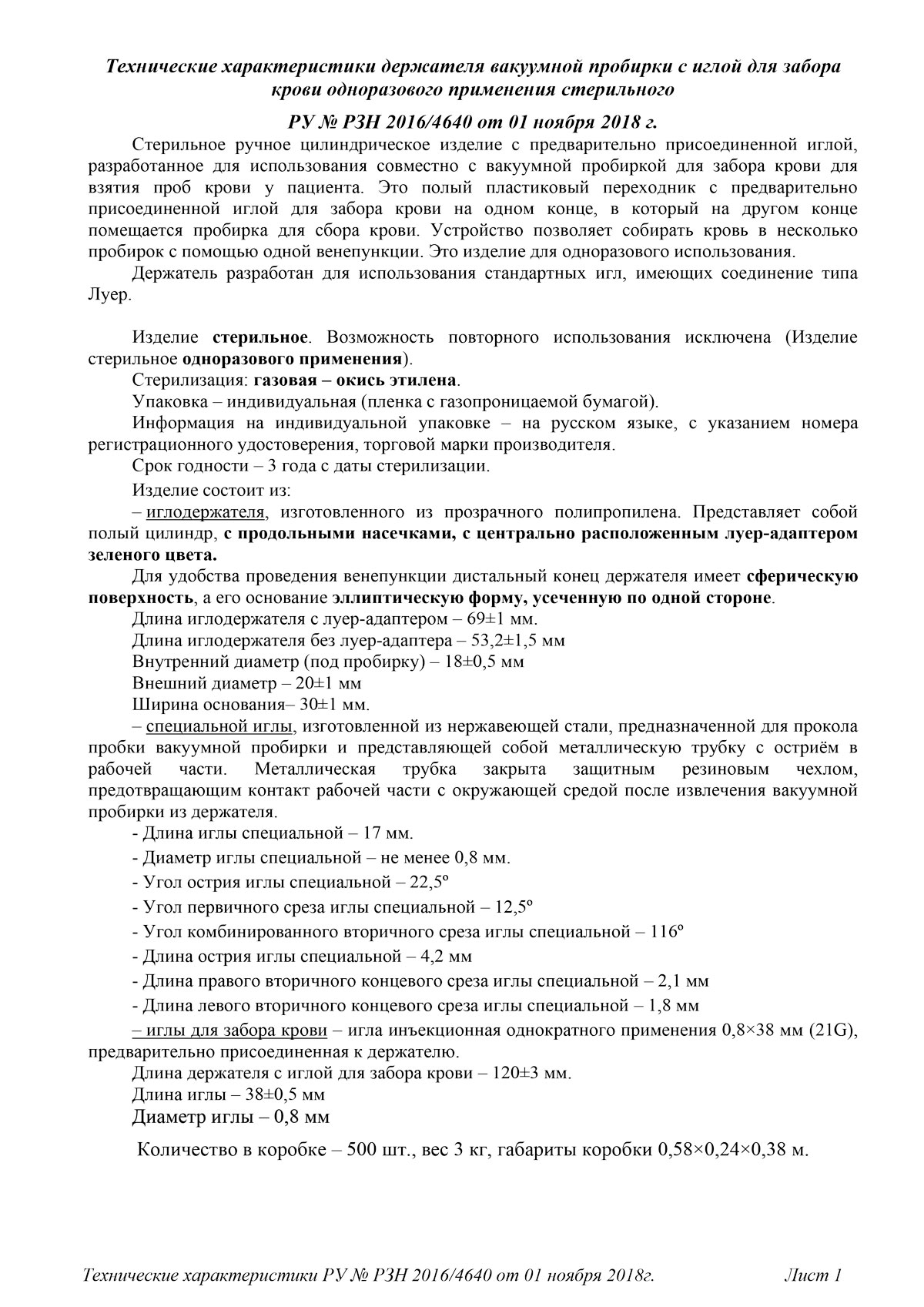 - Держатель вакуумной пробирки с иглой для забора крови стер. Технич. характеристи