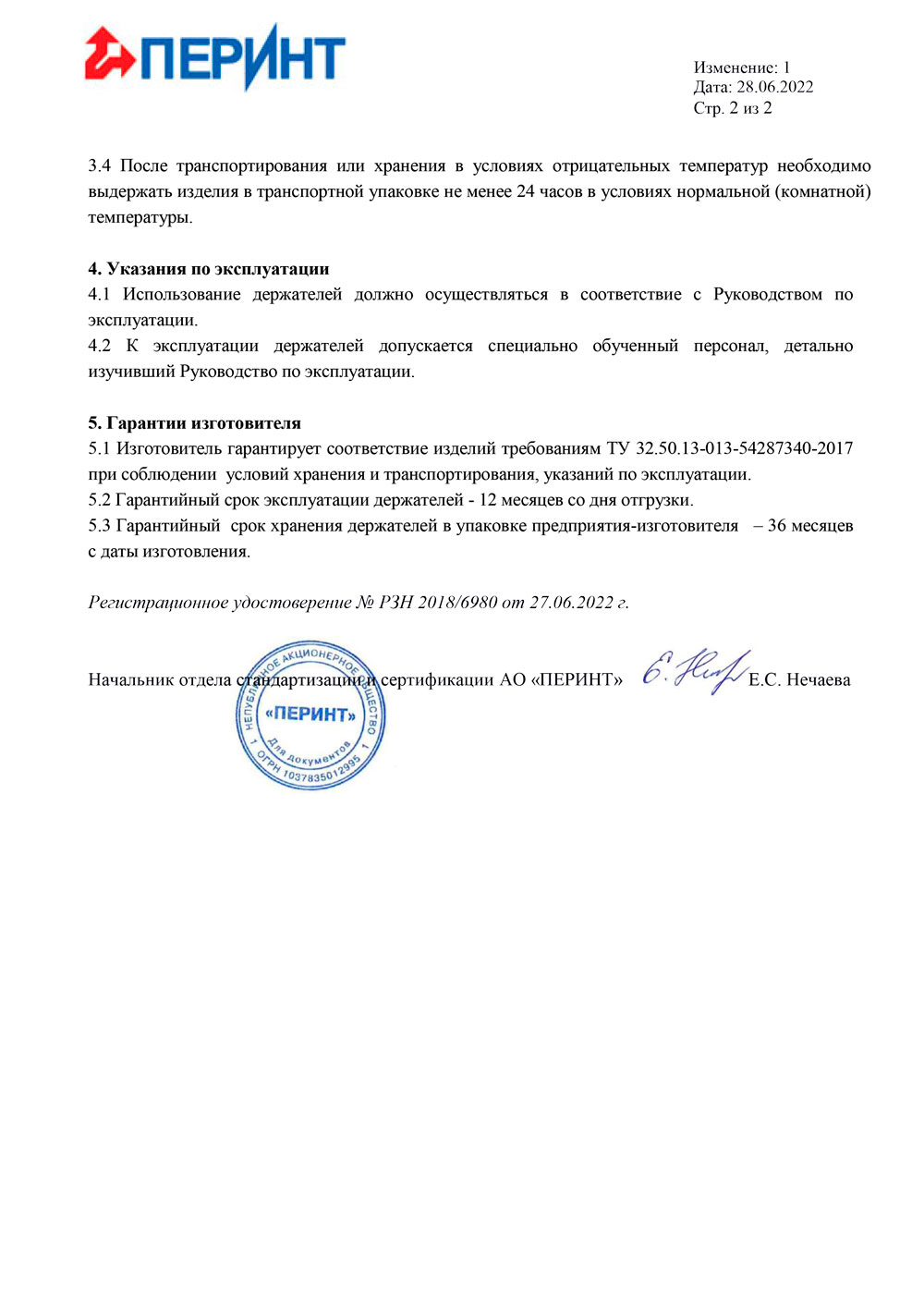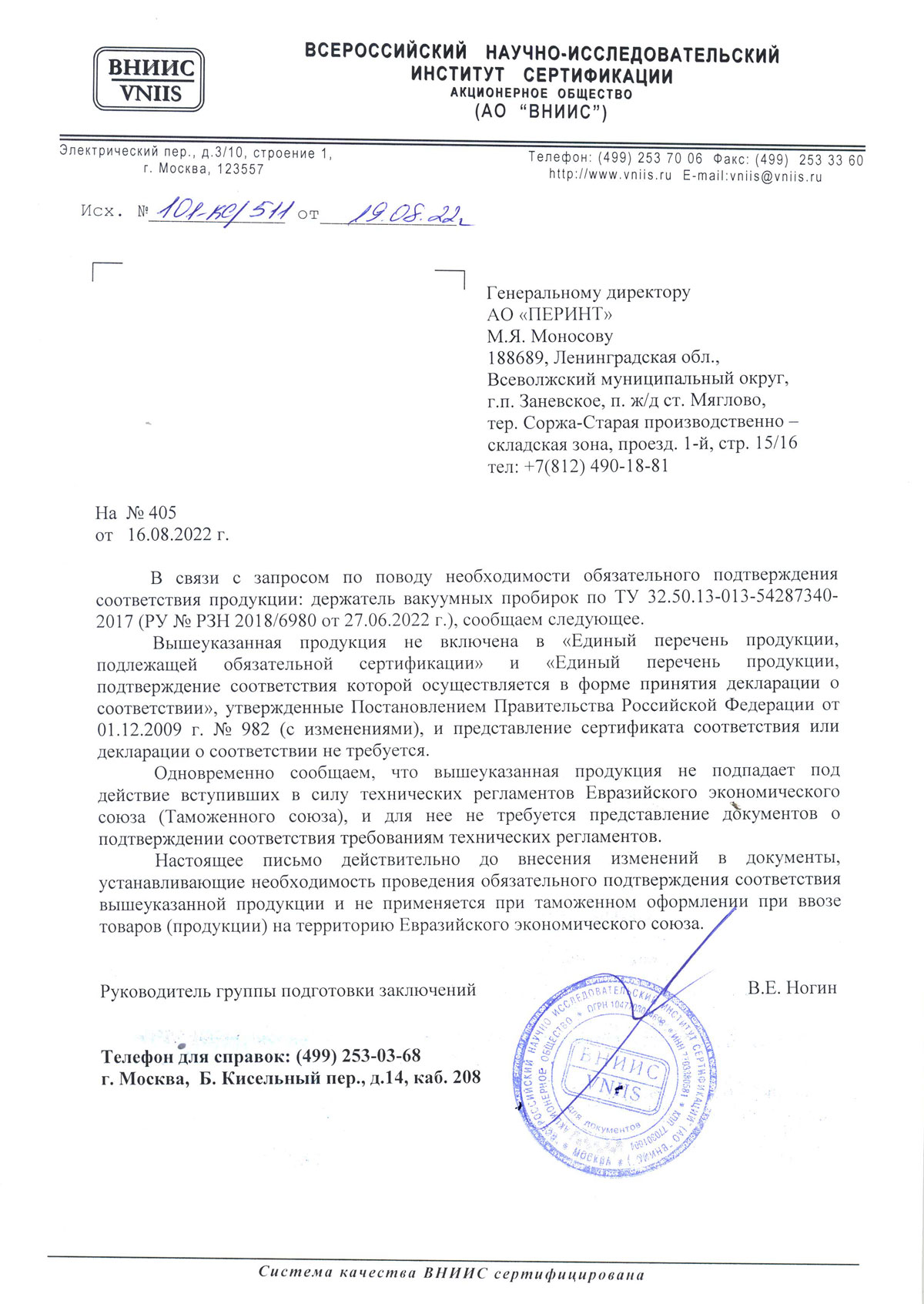 - Держатель вакуумных пробирок. Перинт. Отказное письмо по сертификации 2022