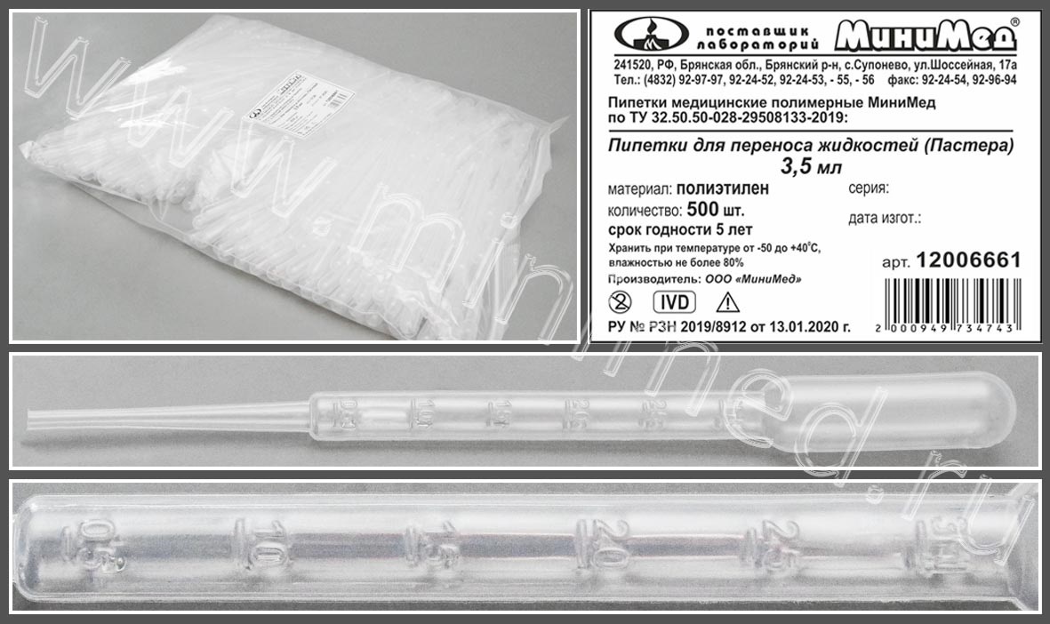 Пипетка для переноса жидкости (Пастера) 3,5 мл. н/стер, ТУ 32.50.50-028-29508133-2019, уп. 500 шт, МиниМед