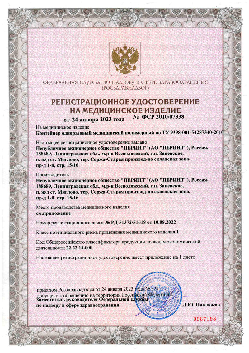 - Контейнер одноразовый медицинский полимерный. ПЕРИНТ. РУ-2023-2