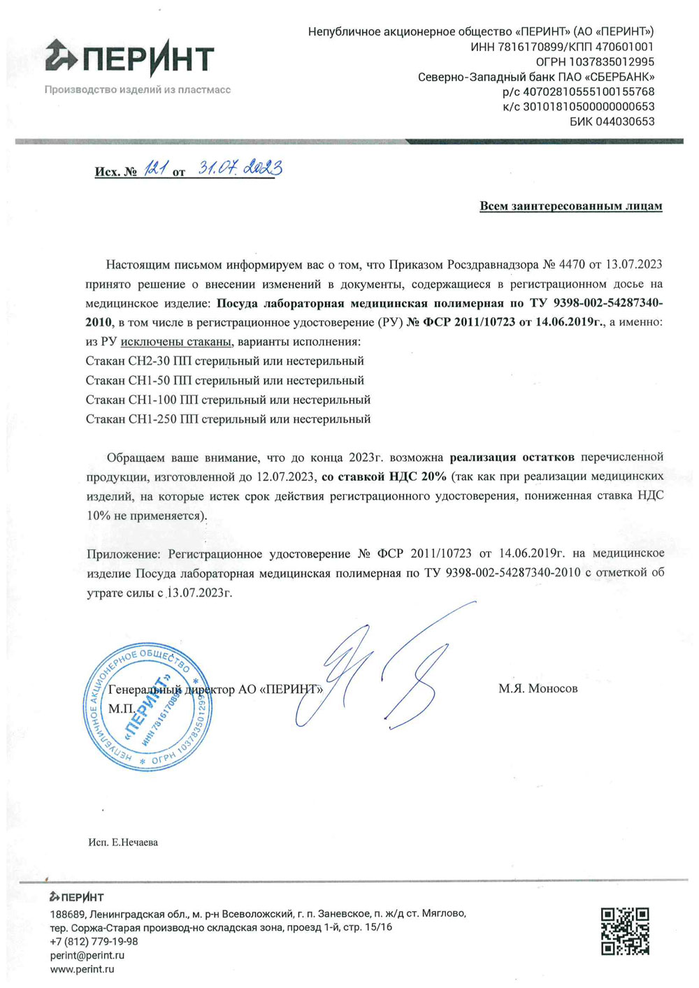 - Стаканы. АО Перинт. Инф. письмо об исключение стаканов из РУ ПЛМП с 13.07.2023