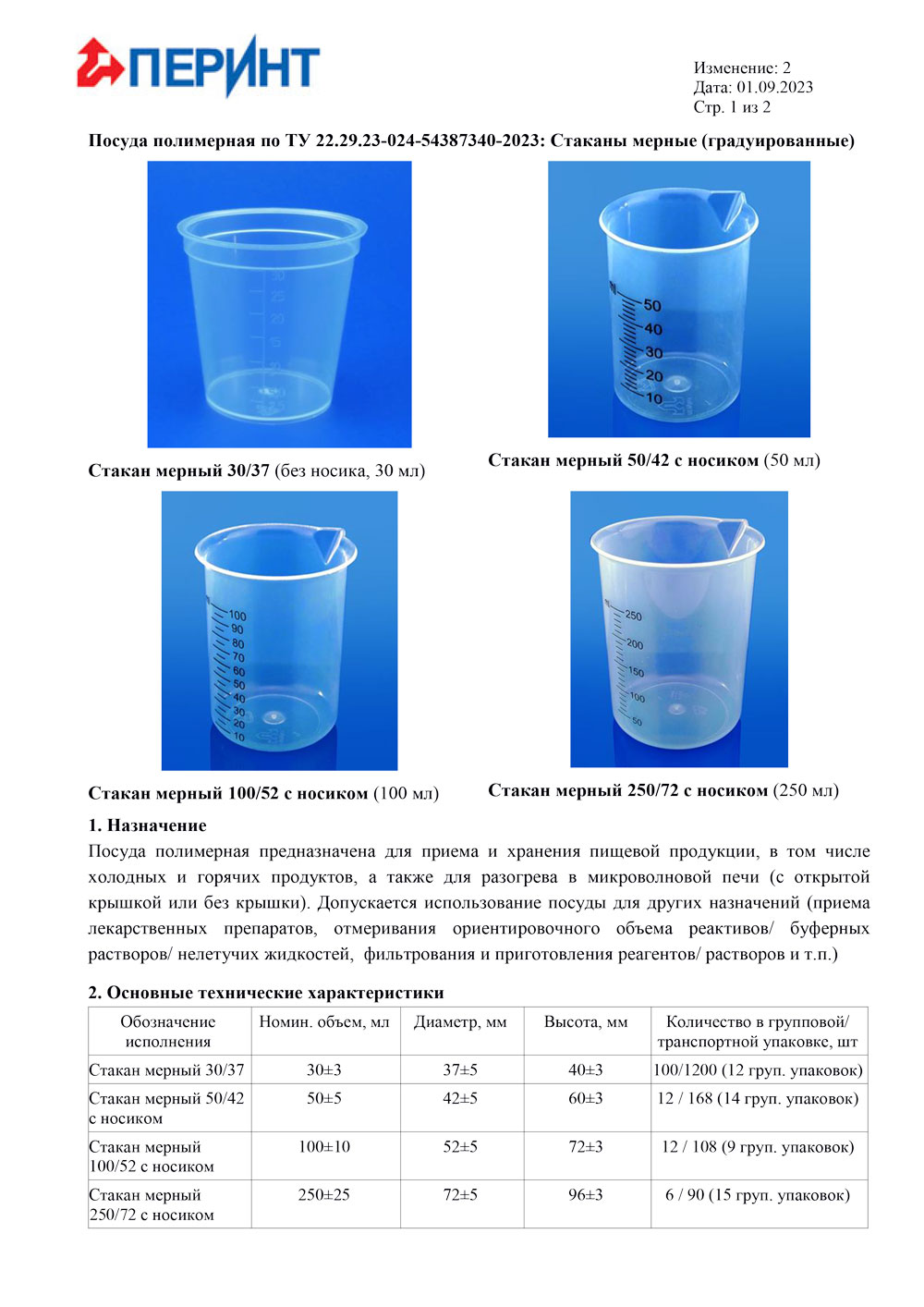 - Стаканы мерные (градуированные) 30-250. Перинт. Тех. данные от 01.09.2023-2