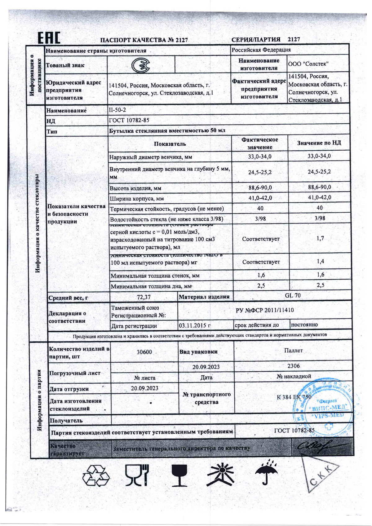 Бутылка стеклянная тип ll-50-2-МТО, для крови, трансфузионных и инфузионных препаратов по ГОСТ 10782-85, уп.180 шт