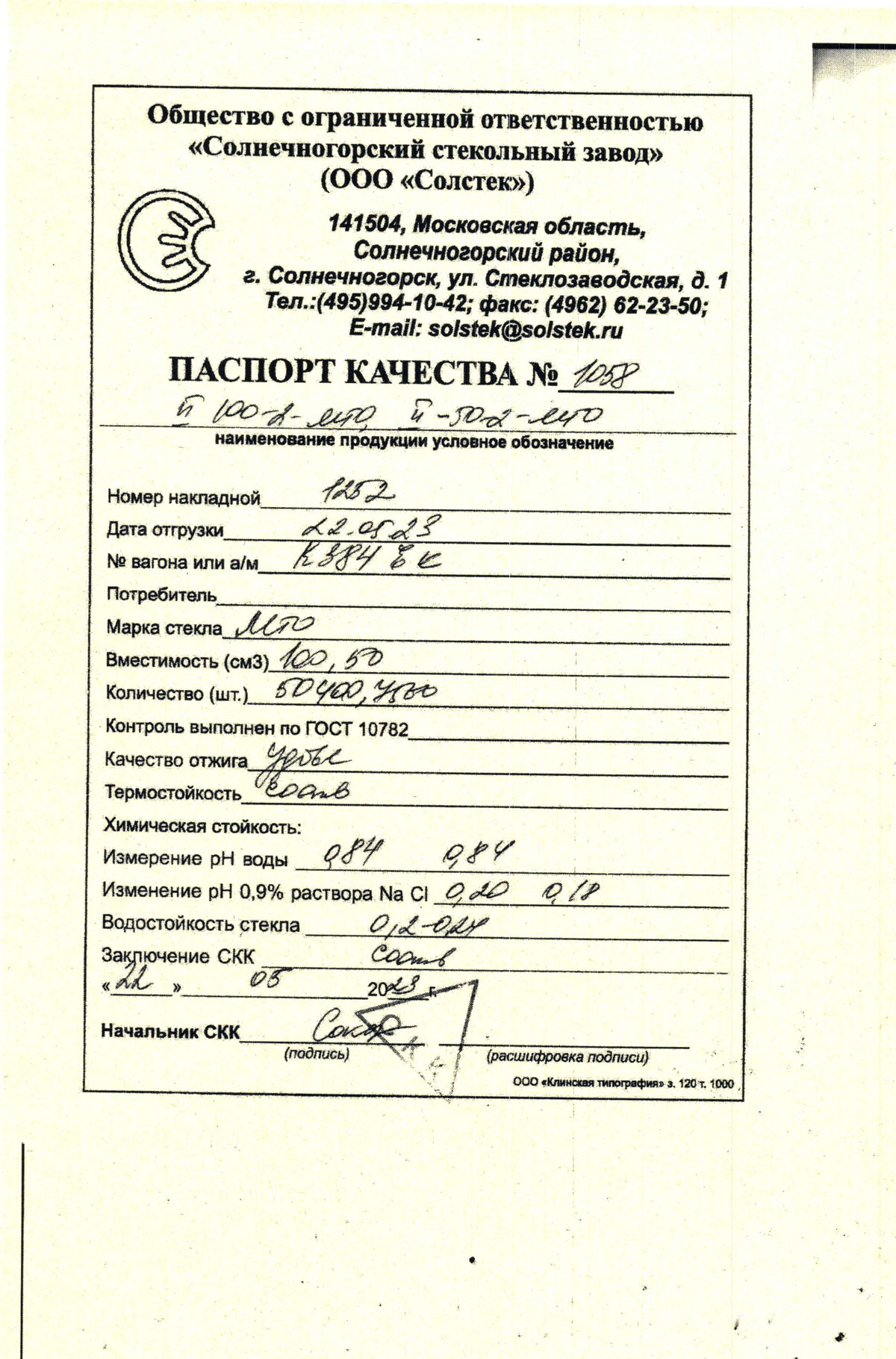 Номинальная вместимость, мл........................... 50