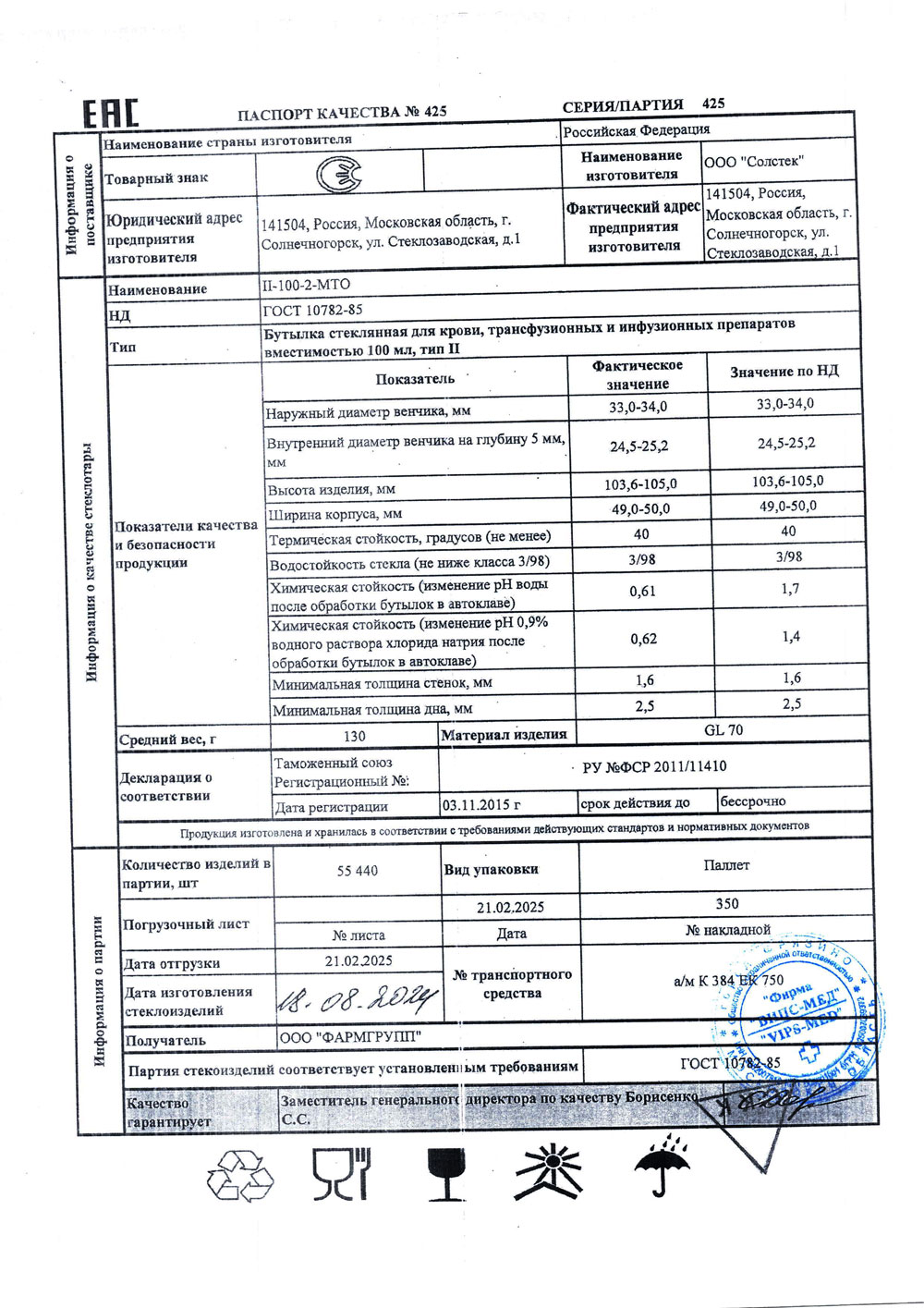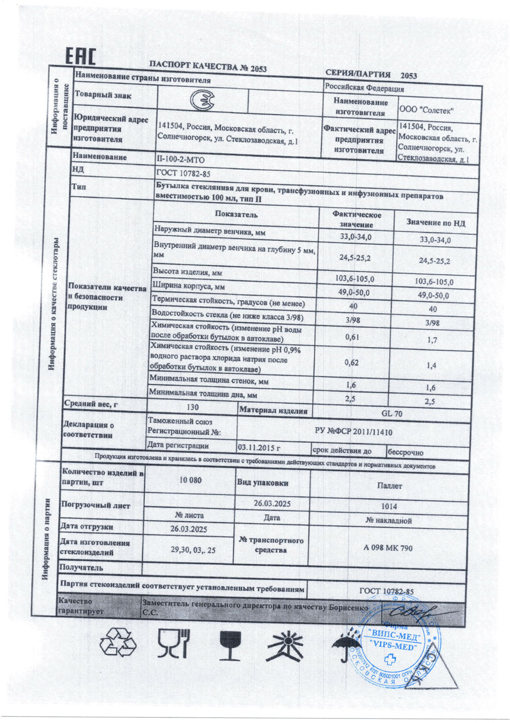 Бутылка стеклянная для крови, трансфузионных и инфузионных препаратов ll-100-2-МТО, уп. 120 шт.
