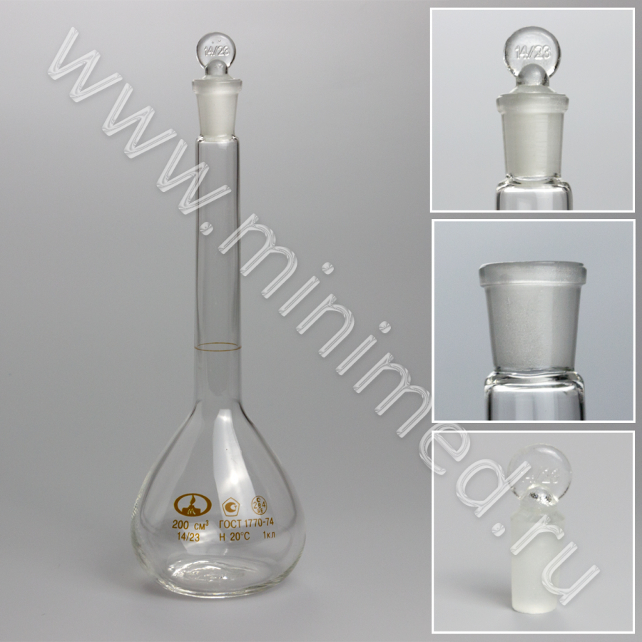 Колба 2-200-1 мерная, с пришлифованной пробкой 14/23, 1 класс, ГОСТ 1770-74, МиниМедПром, инд.уп./48 шт.