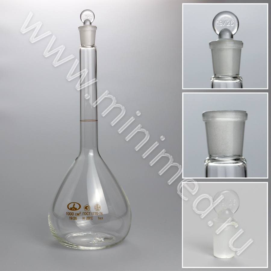 Колба 2-1000-1 мерная, с пришлифованной пробкой 19/26, 1 класс, ГОСТ 1770-74, МиниМедПром, инд.уп./24 шт.