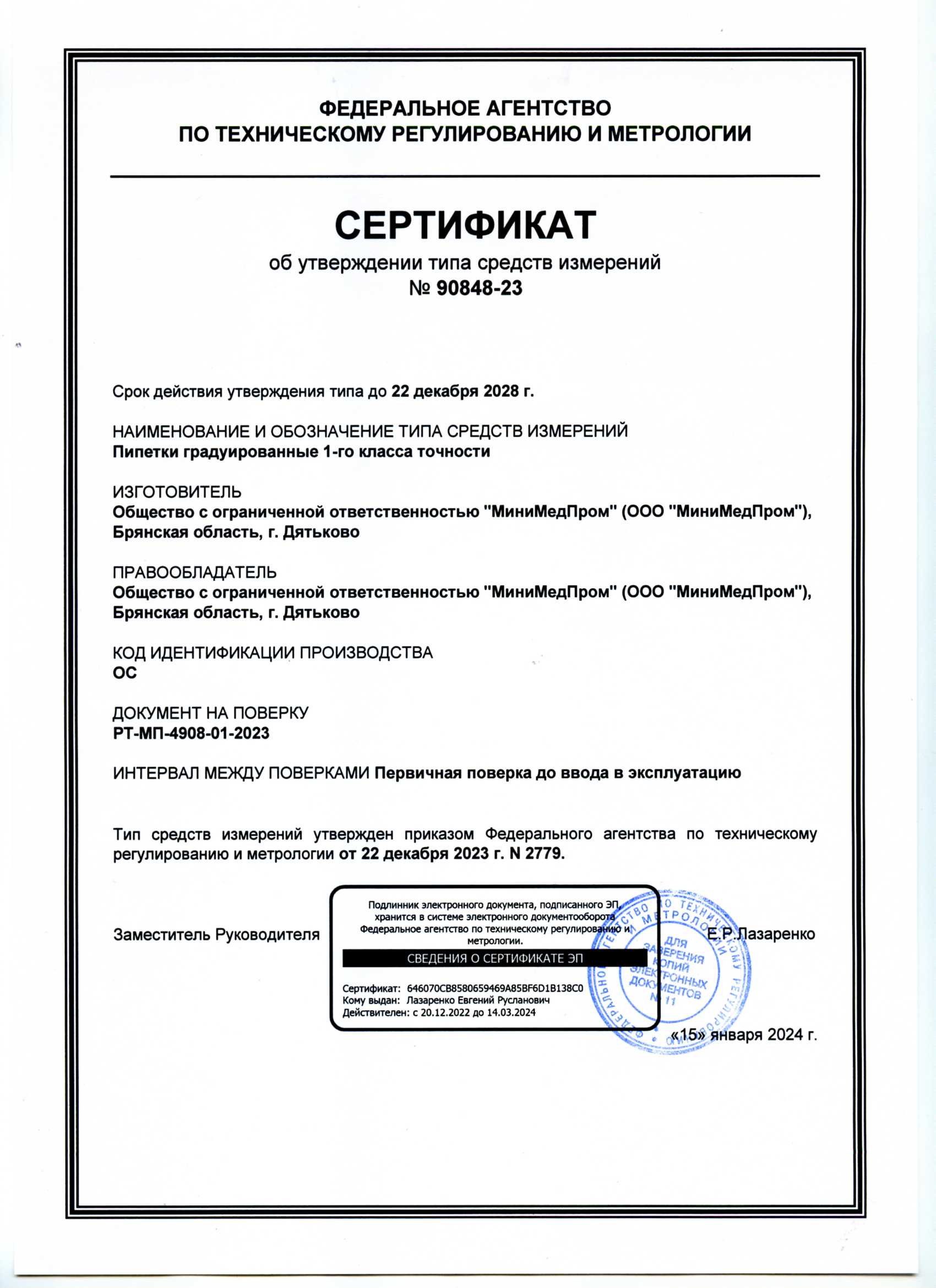 - Пипетки градуированные 1 класса точности тип 2, 4. ММП. Сертификат об утверждени