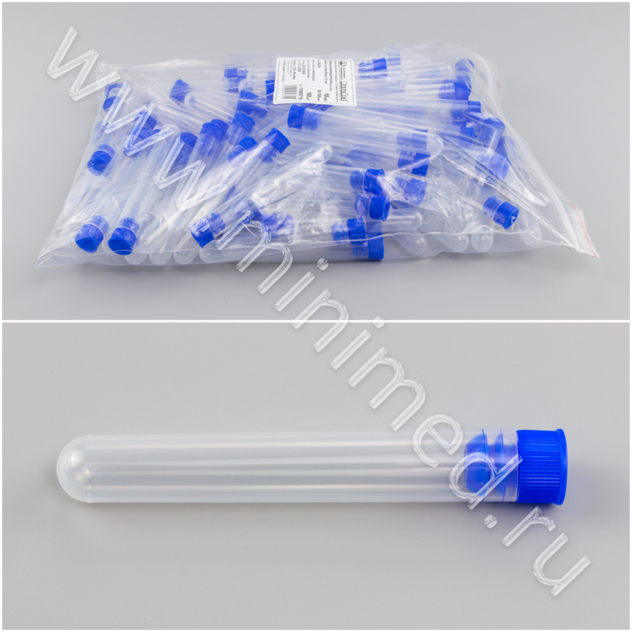 Предназначены для отбора проб, проведения химических, биологических, микробиологических анализов, в малых объемах химических реакций. Нестерильная. Укомплектована пробкой синего цвета.