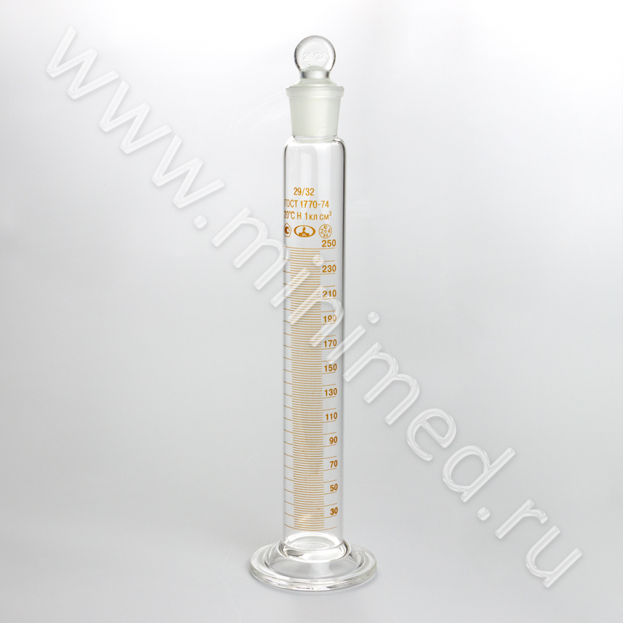 Цилиндр 2-250-1 мерный с пришлиф. пробкой на стекл. основании, 1 класс, ГОСТ 1770-74, МиниМедПром, инд.уп./32 шт.