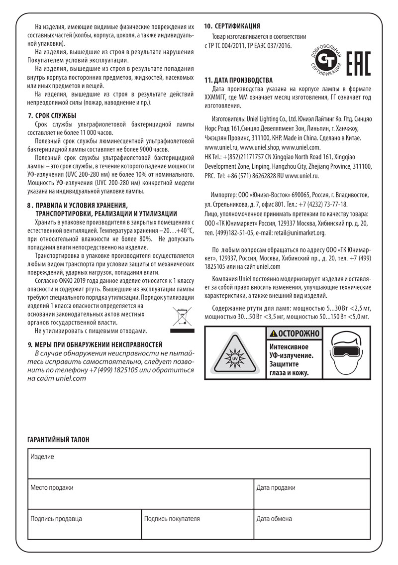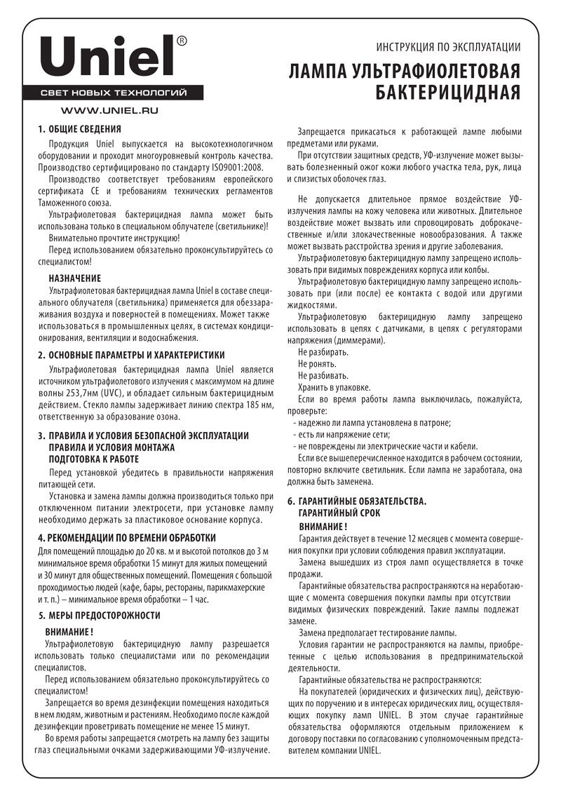 Ультрафиолетовая бактерицидная лампа UNIEL применяется для обеззараживаниясвоздуха и поверхностей в помещениях. Может также использоваться в промышленных целях, в системе кондиционирования, вентиляции и водоснабжения. Людям и домашним животным не рекомендуется находиться в одном помещении с работающей УФ-лампой.