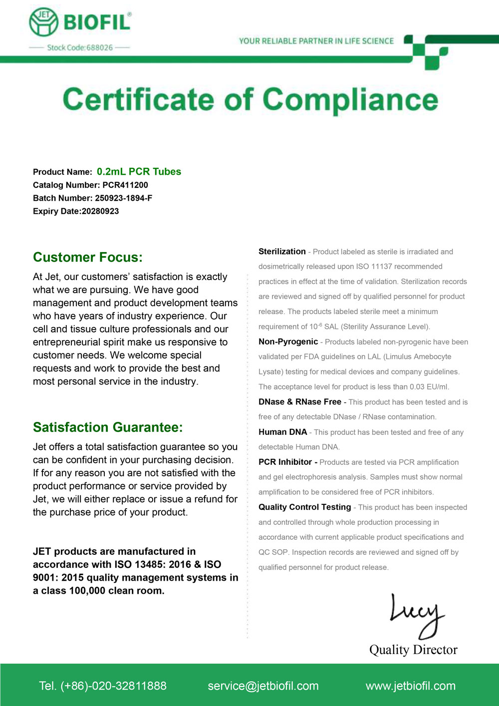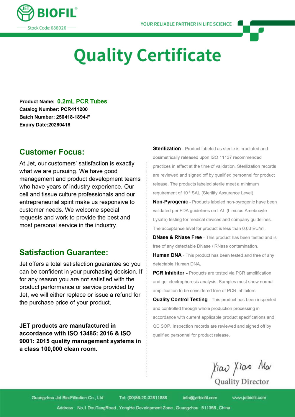 - Сертификат. Микропробирка 0,2 мл, тип Эппендорф, для ПЦР, Jet Bio-Filtration-PCR