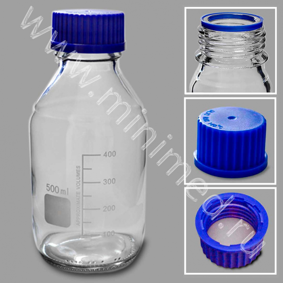 Предназначена для хранения химических реактивов. Изготовлена из химико-лабораторного стекла, крышка изготовлена из полипропилена. На горлышке есть уплотнительное кольцо. Градуированы до 400 мл.