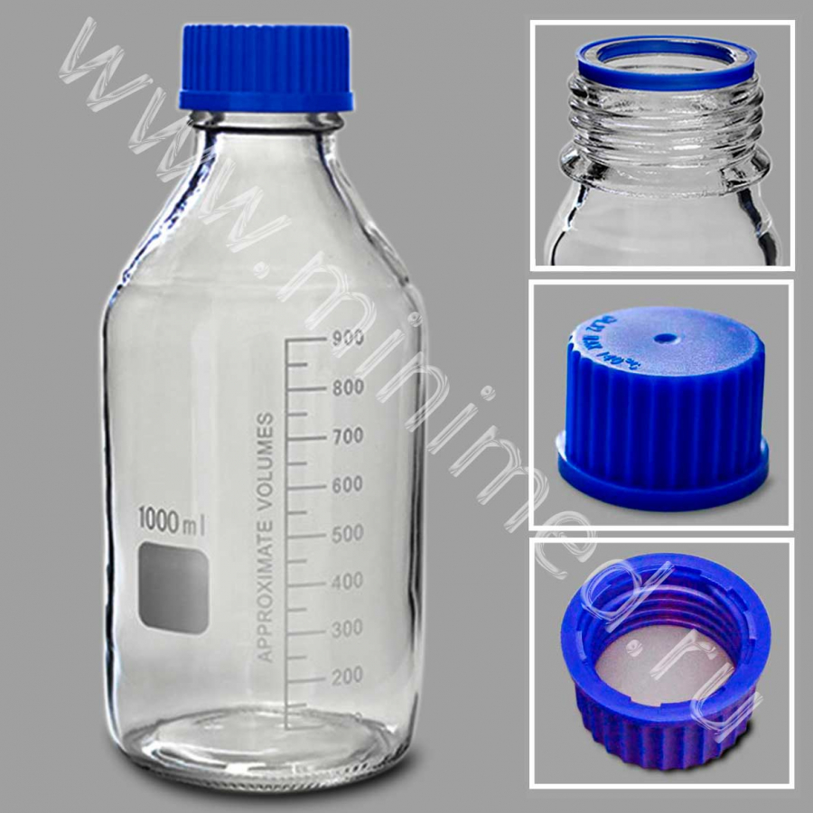 Предназначена для хранения химических реактивов. Изготовлена из химико-лабораторного стекла, крышка изготовлена из полипропилена. На горлышке есть уплотнительное кольцо. Градуированы до 900 мл.