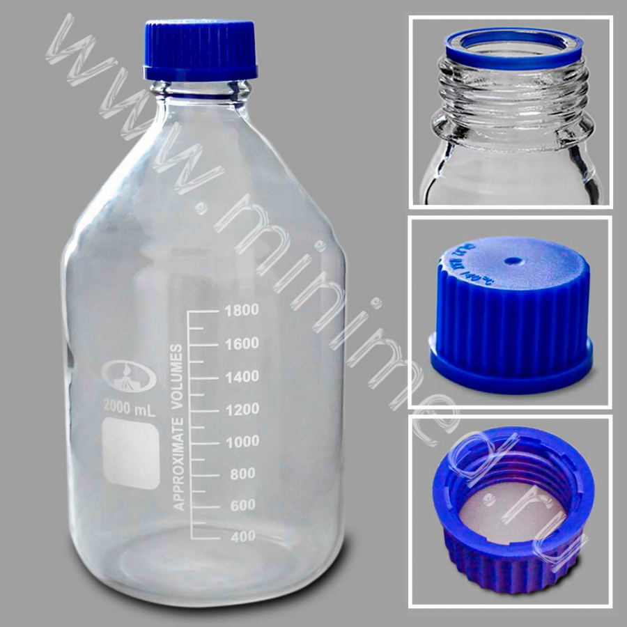 Предназначена для хранения химических реактивов. Изготовлена из химико-лабораторного стекла, крышка изготовлена из полипропилена. На горлышке есть уплотнительное кольцо. Градуированы до 1800 мл