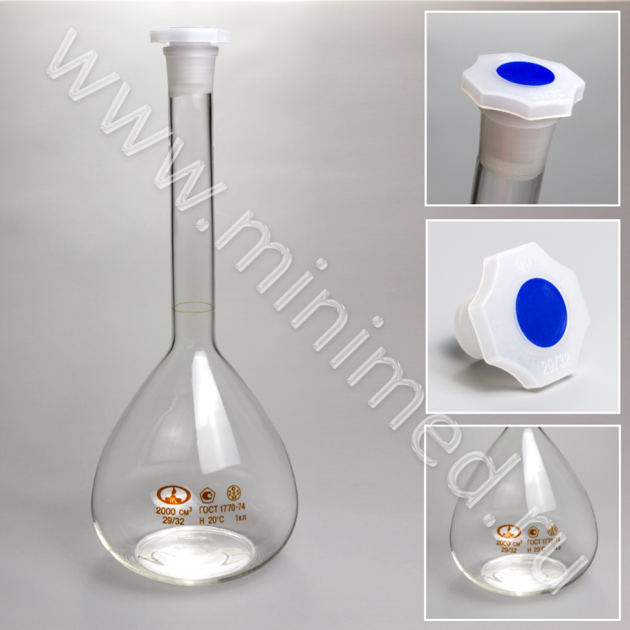 Колба 2а-2000-1 мерная, с пробкой, 1 класс, ГОСТ 1770-74, инд.уп./12 шт, МиниМедПром