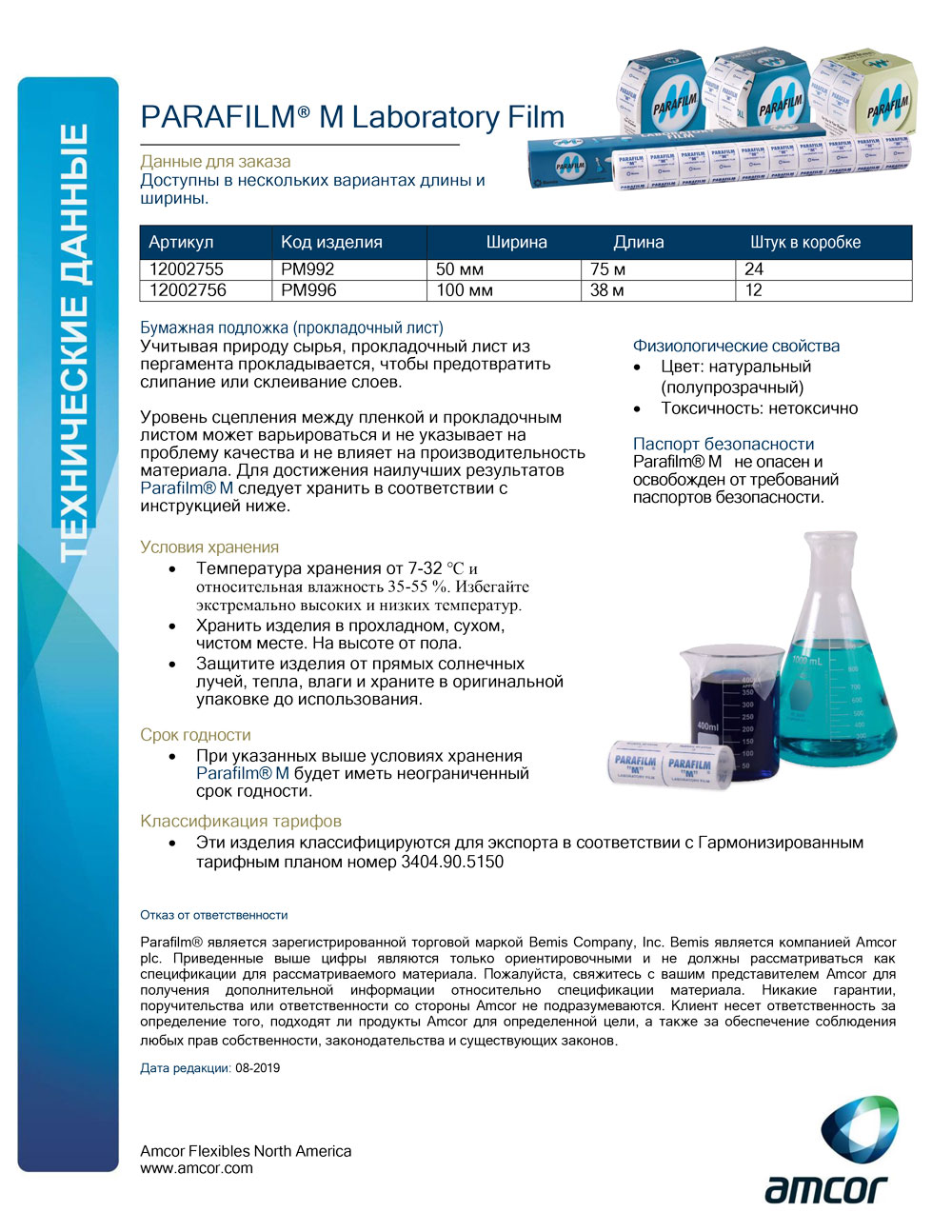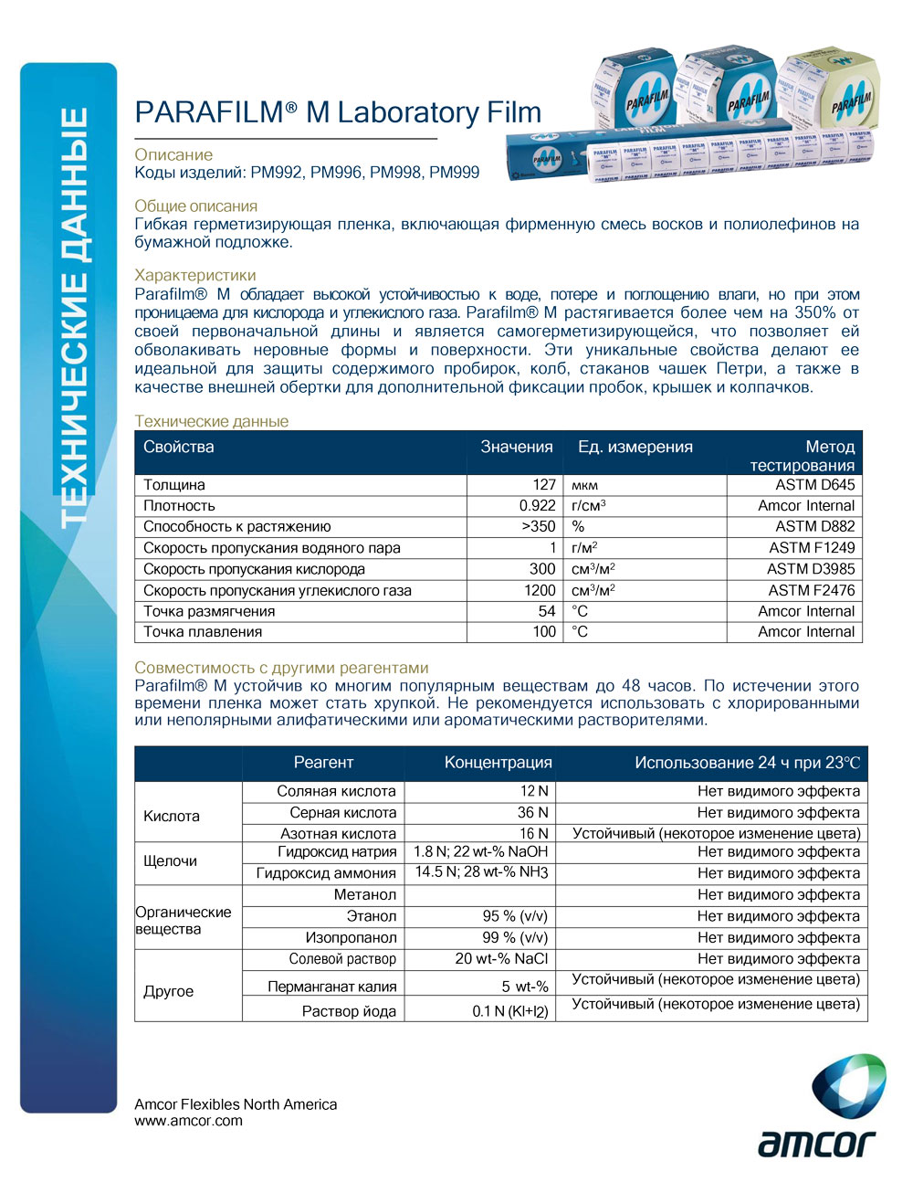 Парафинизированная пленка "PARAFILM" M подходит для пробирок, колб, стаканов, чашек Петри, для дополнительной фиксации пробок, колпачков, крышек. Состоит из полиолефинов и парафиновых восков. Может растягиваться до 350% и закрывать углы и неровные поверхности, обеспечивая герметичность. Пленка устойчива на протяжении 48 часов к воздействию многих полярных реактивов: растворы солей, неорганические кислоты и щелочные растворы. По истечении 48 часов пленка может стать хрупкой.