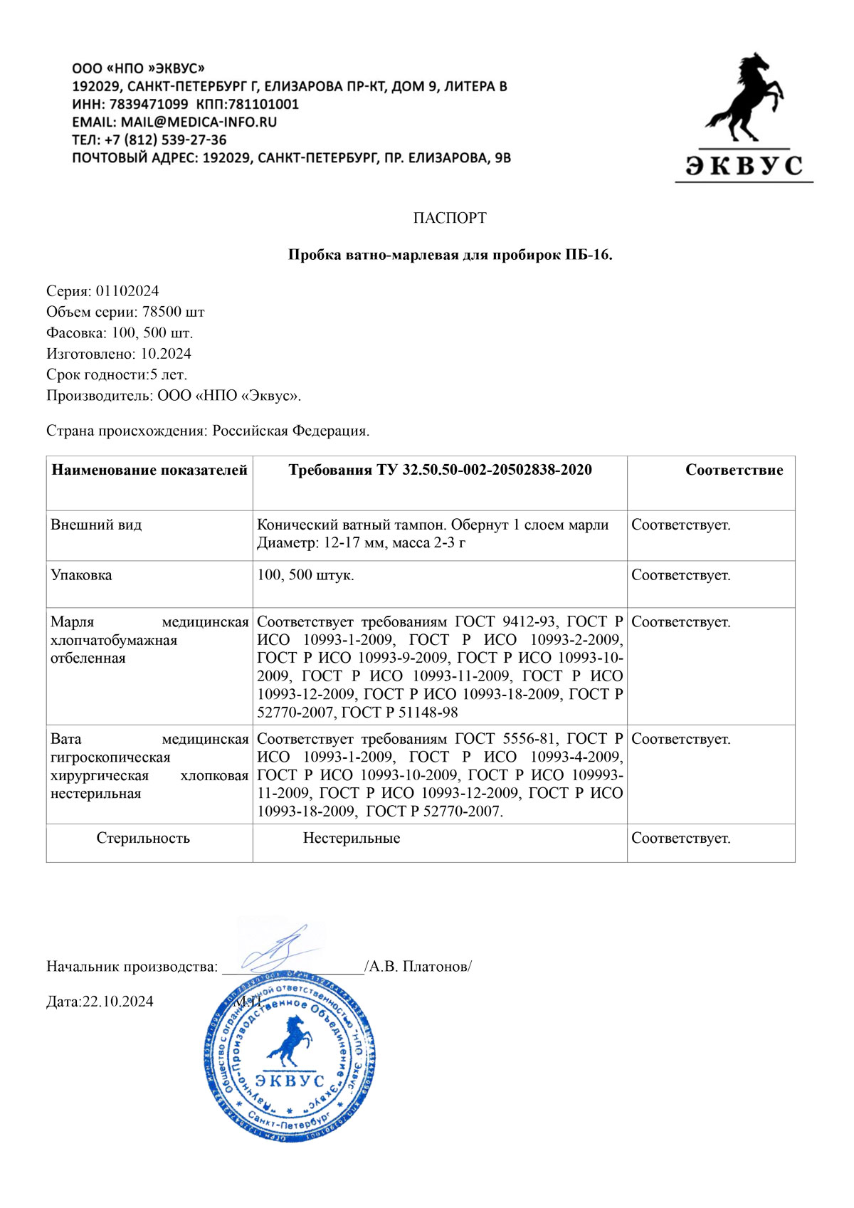 Пробка ватно-марлевая для пробирок ПБ-16, нестерил, 100шт/уп