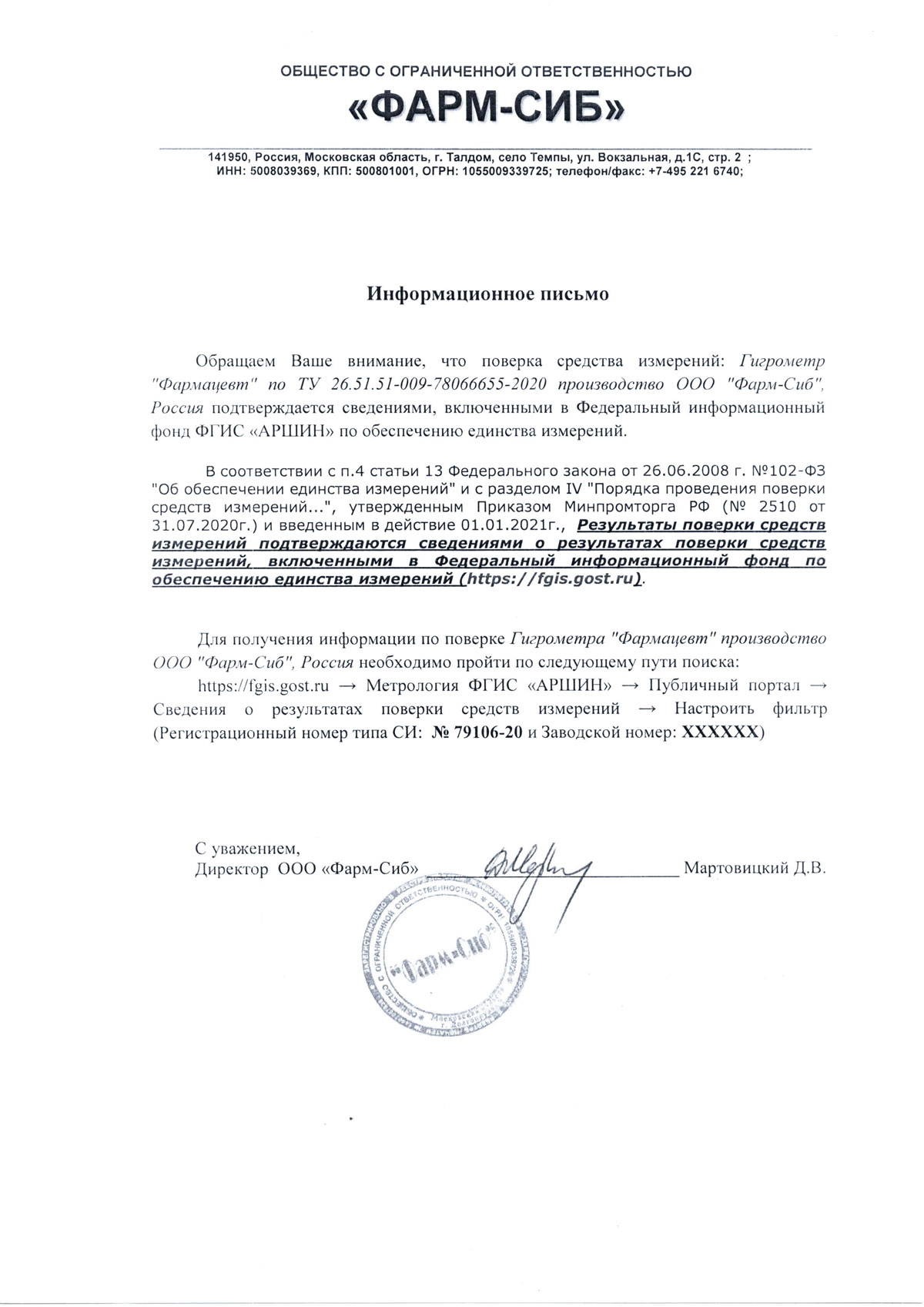 - Гигрометры Фармацевт. ООО Фарм-Сиб. Инф. письмо