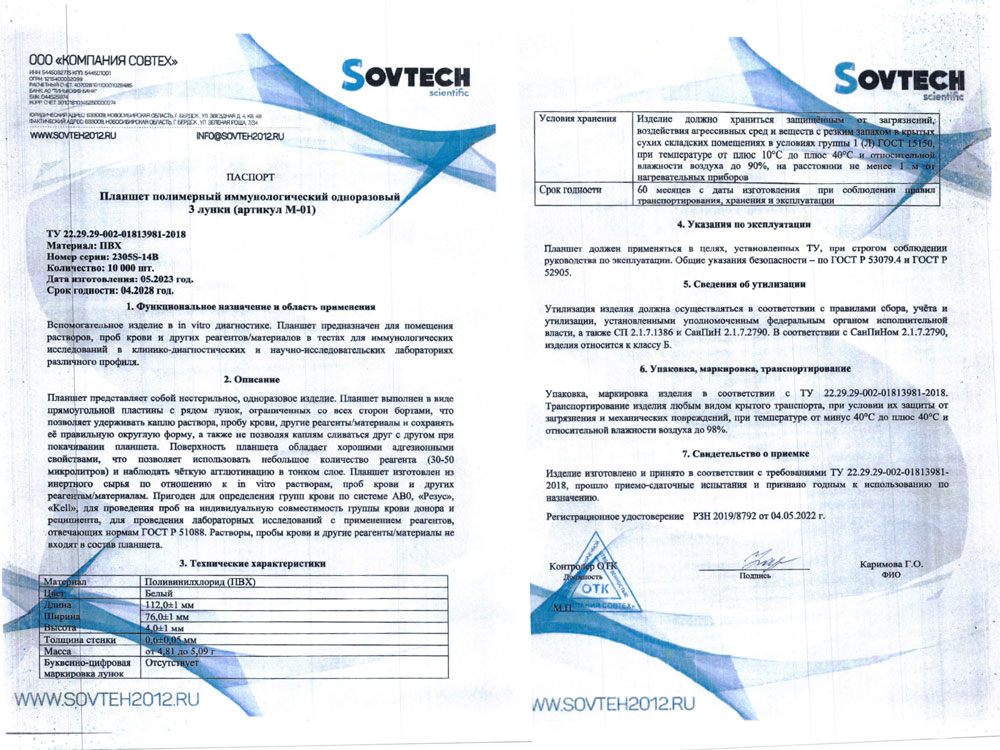 Планшет предназначен для определения групп крови методом прямой реакции агглютинации и проведения проб на совместимость донора и реципиента. Планшет сделан специально таким образом, что капля находится в центре лунки и позволяет четко рассмотреть агглютинацию. Лунки круглые, плоскодонные.