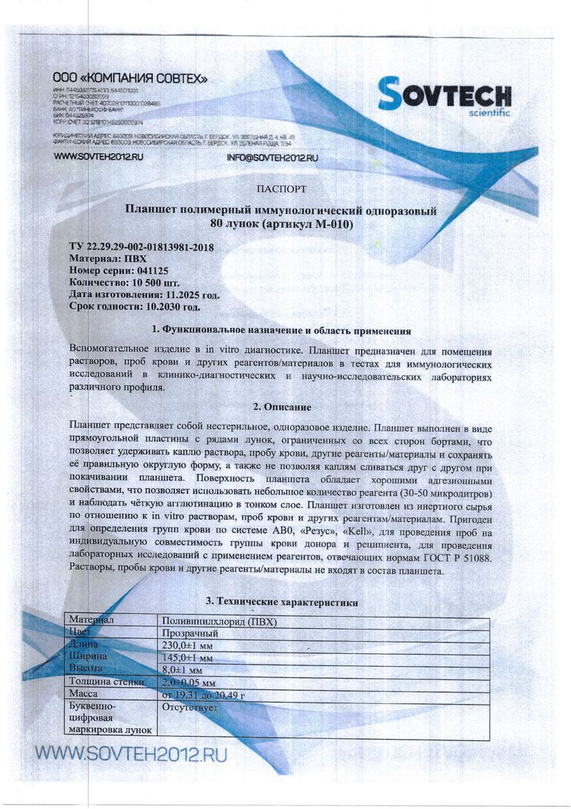Планшет полимерный иммунологический одноразовый 80 лунок, прозрачный, уп.10 шт