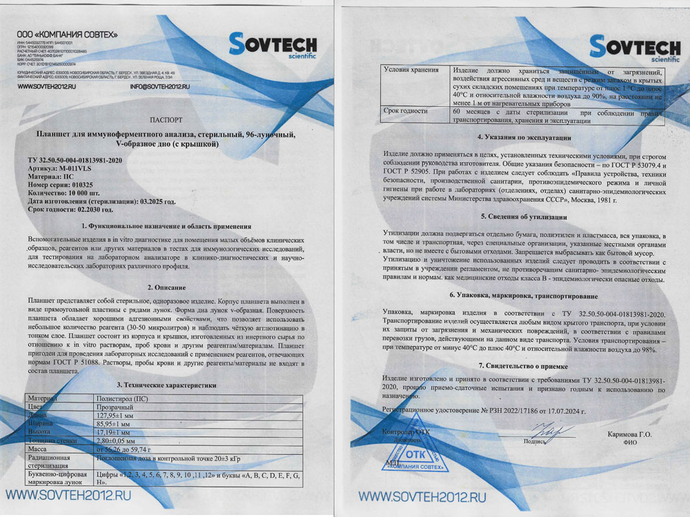 Планшет предназначен для иммунологических исследований, культуральных работ и других лабораторных исследований. Коническое дно лунки рекомендуется для проведения работ с крупными белками, где возможно «налипание» неспецифического материала по краям лунки и при работе с сильно разбавленными образцами. V-образное дно лунки очень полезно, когда требуется полное извлечение пробы. Имеется буквенно-цифровая маркировка, облегчающая проведение анализа. Коэффициент светопропускания донышка планшета превышает 88% при длине световой волны в диапазоне 480—520 нм, с разбросом показателя по всем 96 лункам не более 2,5%. Объем 220мкл.