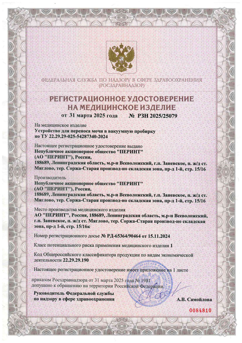 - Устройство для переноса мочи в вакуумную пробирку. Перинт. РУ-2