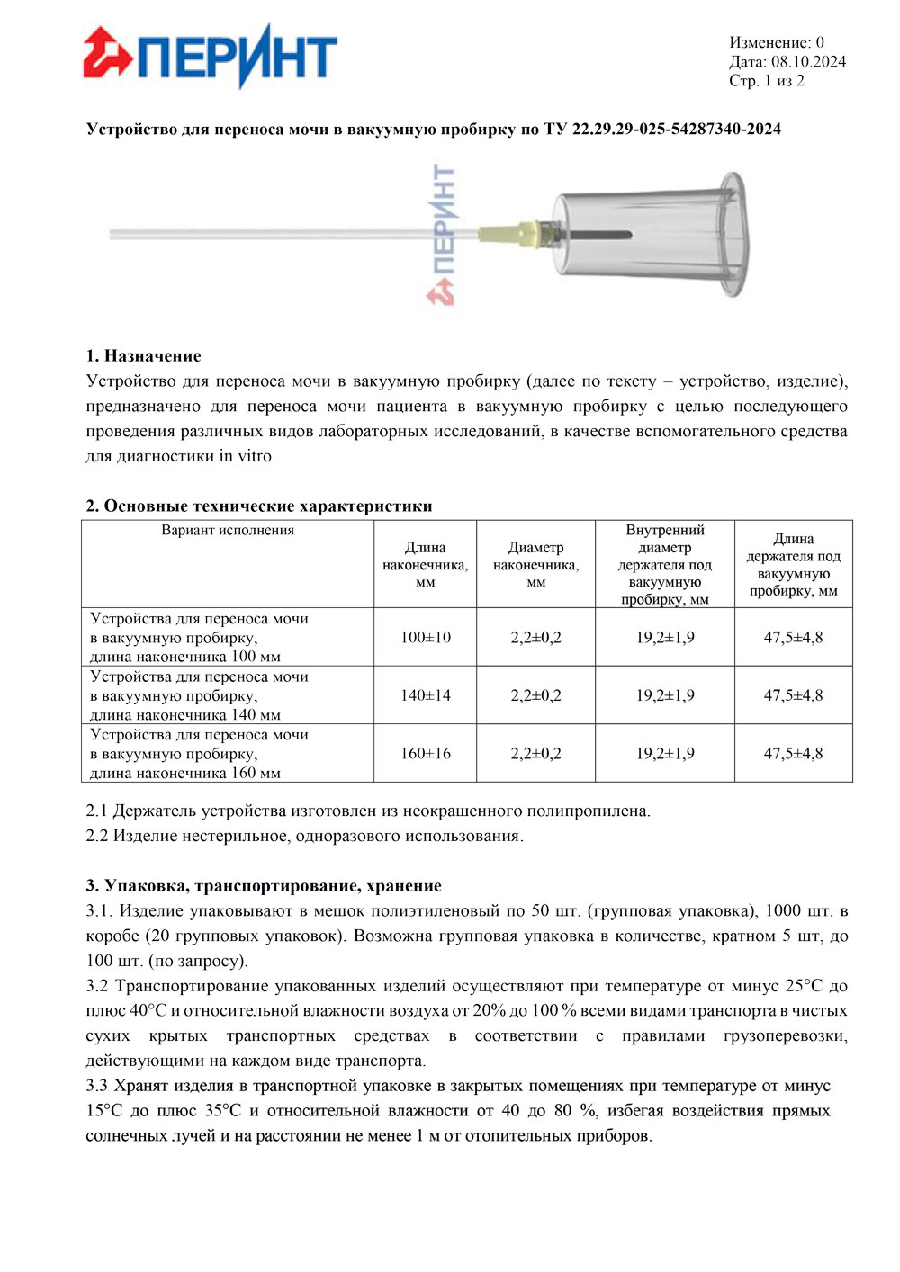 - Устройство для переноса мочи в вакуумную пробирку. Перинт. Тех. данные-2