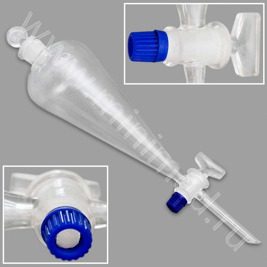 Предназначены для разделения несмешивающихся жидкостей в процедурах экстрагирования. Изделия изготовлены из химико-лабораторного стекла. Материал гайки АБС-пластик.