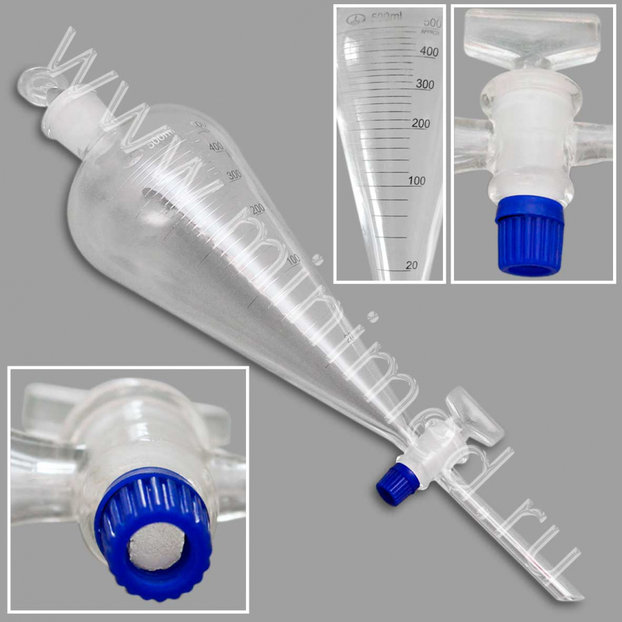 Предназначены для разделения несмешивающихся жидкостей в процедурах экстрагирования. Изделия изготовлены из химико-лабораторного стекла. Материал гайки АБС-пластик.