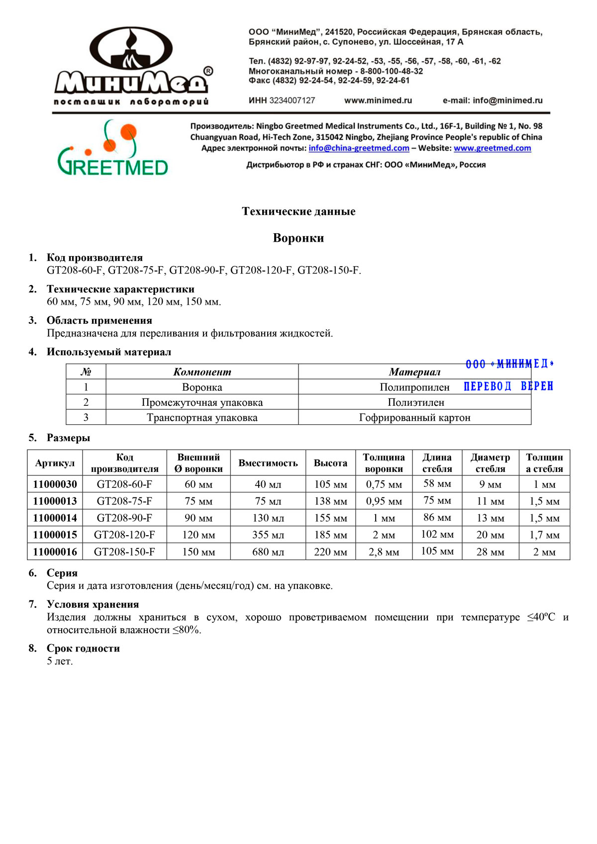 Воронка изготовлена из полипропилена. Предназначена для переливания и фильтрования жидкостей. Подлежит автоклавированию.