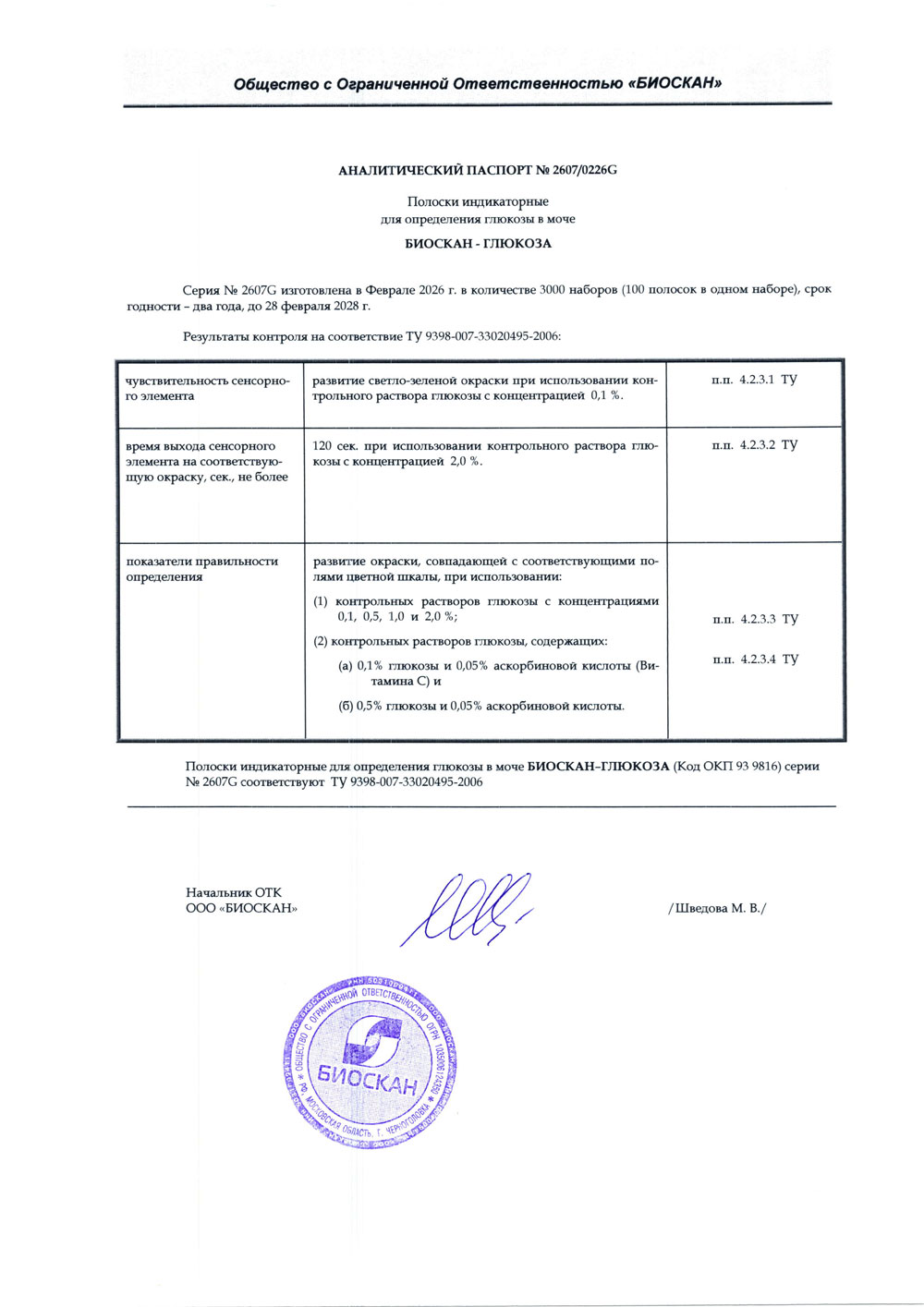 - Полоски индикаторные БИОСКАН-ГЛЮКОЗА, с. № 2537G от 09.2025
