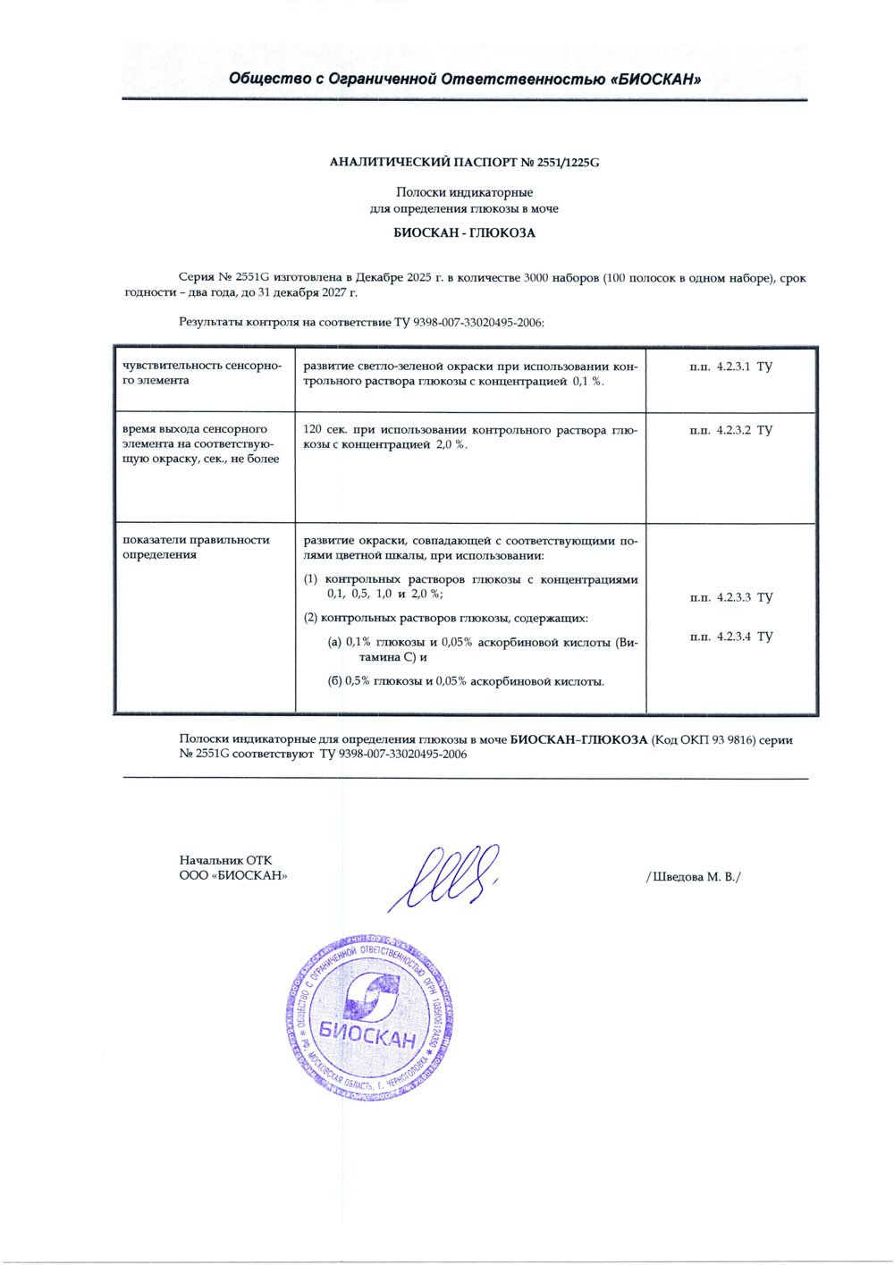 - Полоски индикаторные БИОСКАН-ГЛЮКОЗА, с. № 2551G от 12.2025