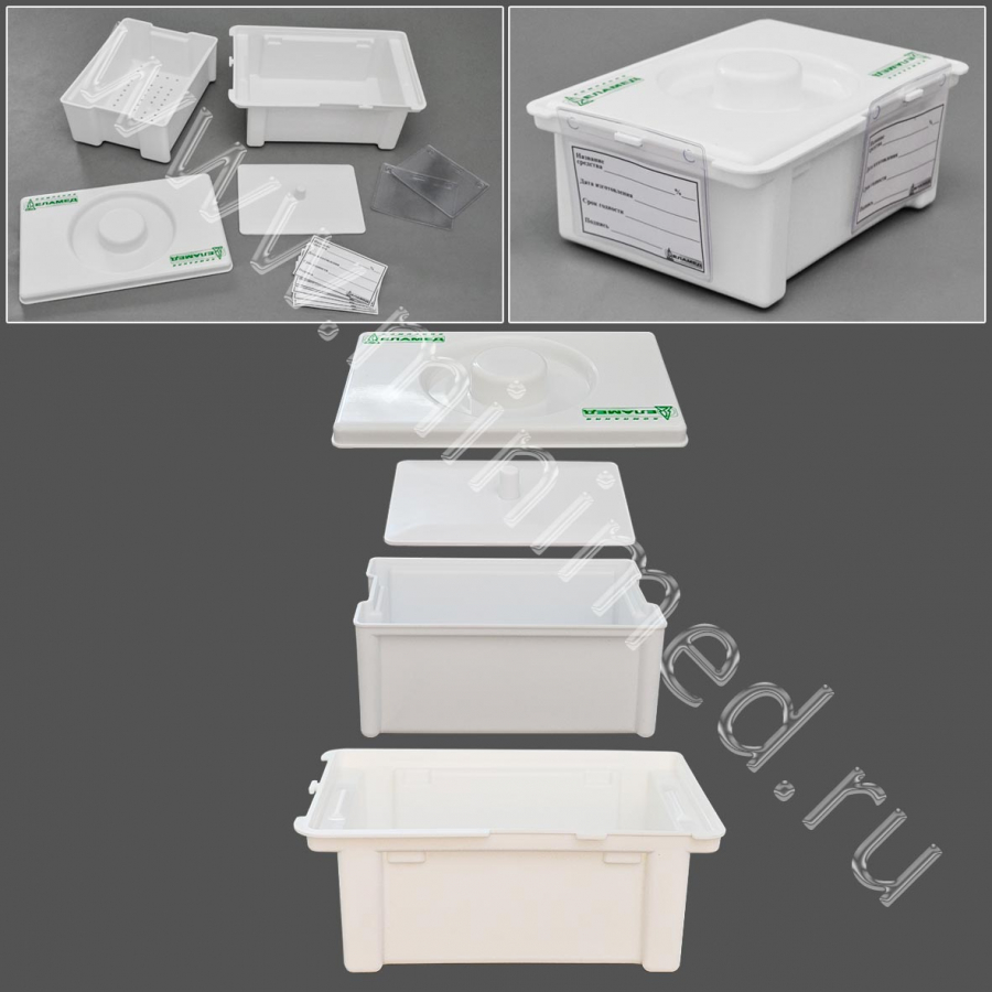 Предназначен для дезинфекции и предстерилизационной очистки изделий медицинского назначения в лечебно-профилактических учреждениях. Емкость-контейнер состоит из корпуса в виде емкости прямоугольной формы с бортиками сверху для удобства переноски и для плотного прилегания крышки, перфорированного поддона, пластины для погружения в раствор легких изделий. В качестве принадлежностей в комплект поставки входят ДВА КАРМАНА. На внешней стороне бортиков корпуса юмеются две зоны для размещения карманов под бумажный носитель служебной информации.