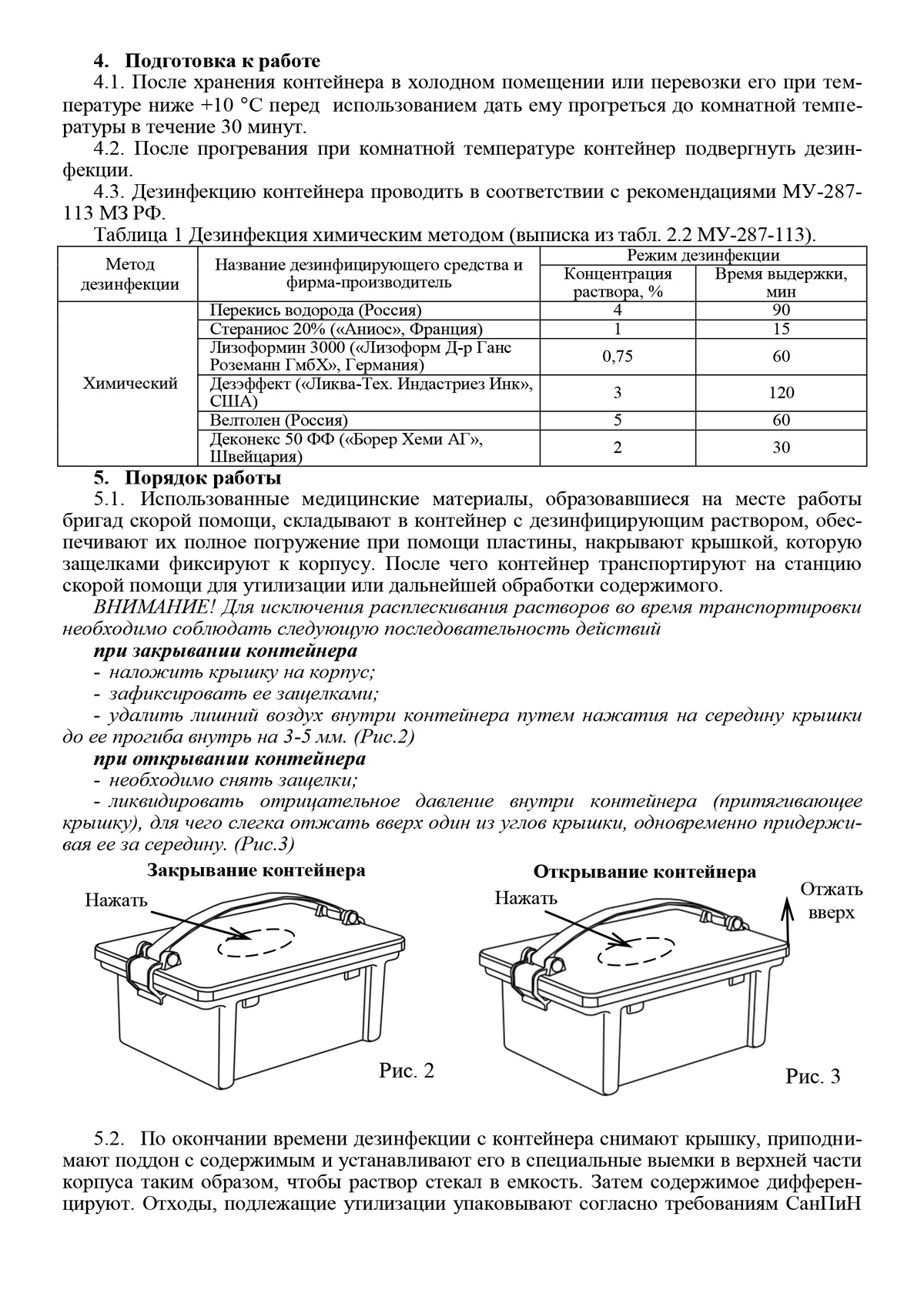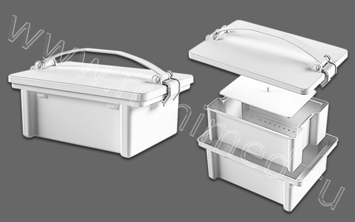 Предназначен для дезинфекции и транспортировки отработанных медицинских материалов и инструментов в передвижных условиях, а также для транспортировки медицинских инструментов внутри лечебно-профилактических учреждений на стадиях предстерилизационной обработки. Рекомендован бригадам скорой помощи и медицины катастроф (МЧС), передвижным (полевым) госпиталям, лечебно-профилактических учреждений (для предутилизационной дезинфекции и хранения опасных медицинских отходов). В контейнер вложены гнет и перфорированный поддон. Имеет прочную удобную ручку для переноса (АБС-пластик). Крышка с зафиксированными защелками исключает выплескивание жидкости из контейнера при грубых толчках. Контейнер устойчив к химическим веществам по ОСТ 42-21-2 и МУ 287-113 МЗ РФ при температуре до +50 градусов С.