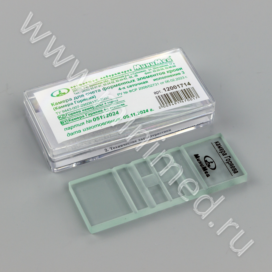 Камера для счета форменных элементов крови (Камера Горяева), 4-х сеточная предназначена для подсчета форменных элементов крови и иных частиц сходных размеров. Изготовлена из оптического стекла марки К-8. Сетка нанесена методом гравировки с максимальной контрастностью при микроскопии и отличной устойчивостью к механическим воздействия. Сетка состоит из 225 больших квадратов. В комплект входят 5 специально полированных покровных стёкол(21х31 мм), обеспечивающих заданную точность объема камеры.