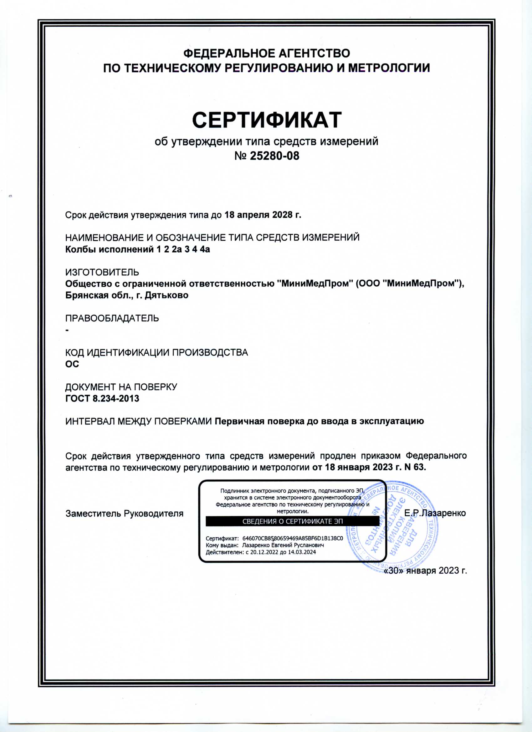 - Колбы исполнения 1, 2, 2а, 3, 4, 4а. ММП. Свидетельство ТСИ до 18.04.2028