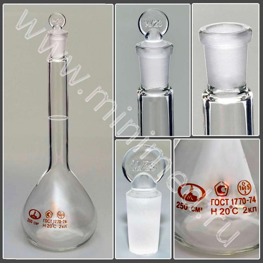 Колба 2-250-2 мерная, с пришлифованной пробкой 14/23, ТУ 9464-013-52876351-2014, ГОСТ 1770-74, МиниМедПром, уп.2 шт./ кор.72 шт