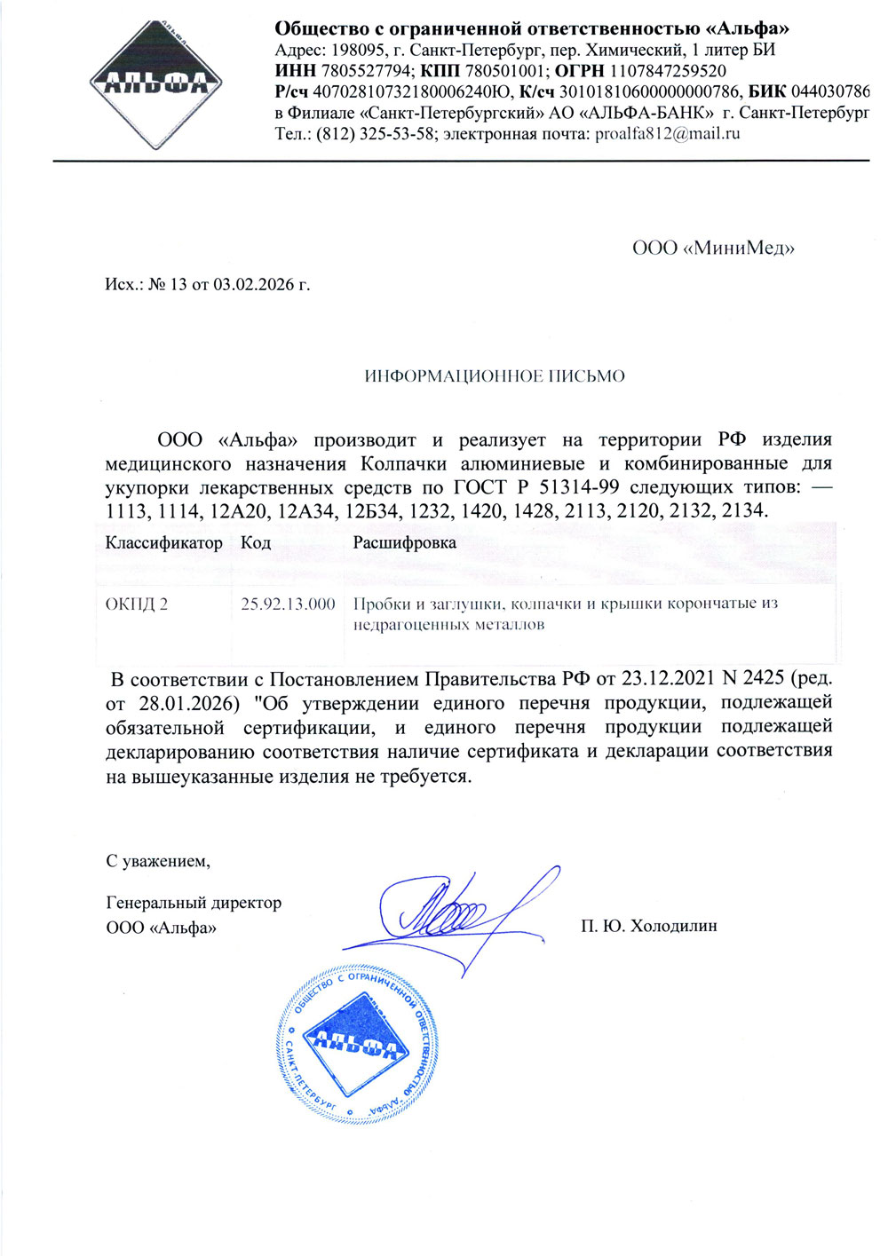 - Колпачки алюмин. и комбинир. Альфа. Уведомление об отмене РУ по ГОСТ