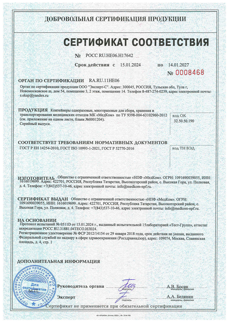 - Контейнеры для сбора, хранения и транспорт. мед. отходов МК-МедКом. Сертификат д