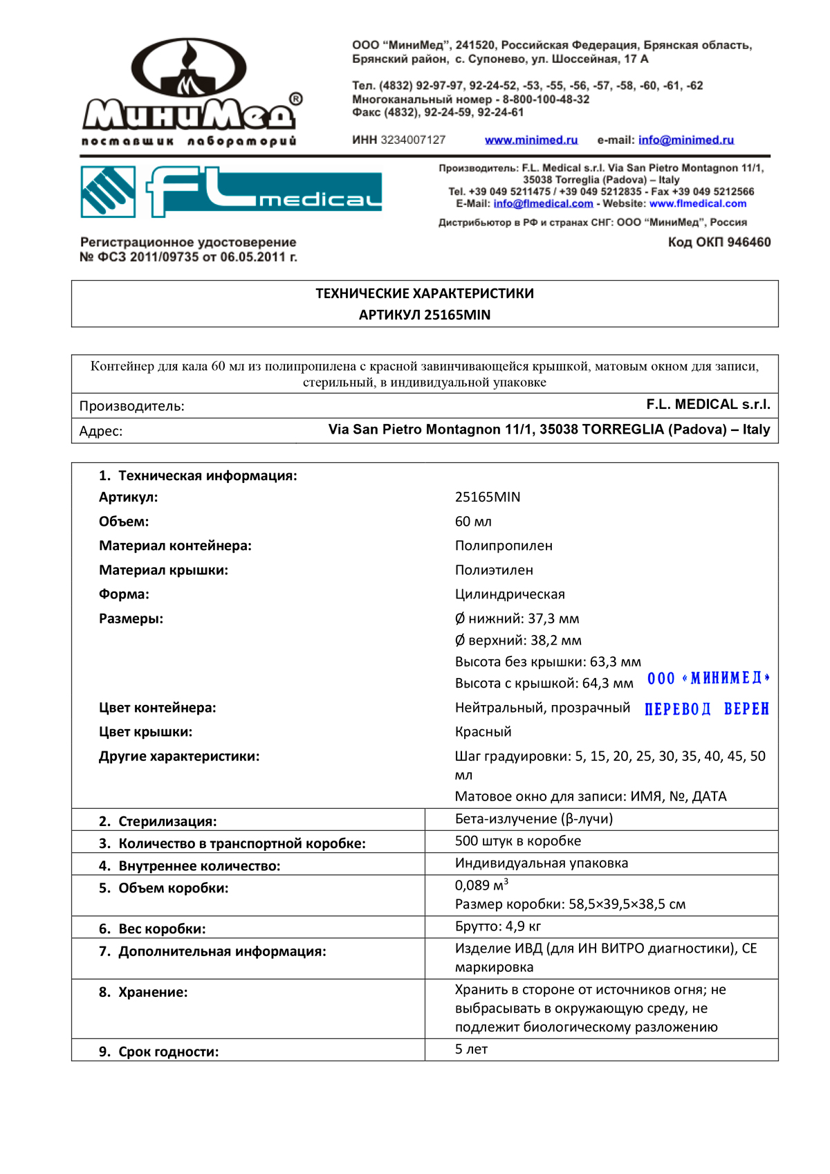 Контейнер лаб. д/взятия проб, 60 мл с завинч. крыш. и шпателем, стер., п/п, инд.уп./уп.500 шт, FL medical