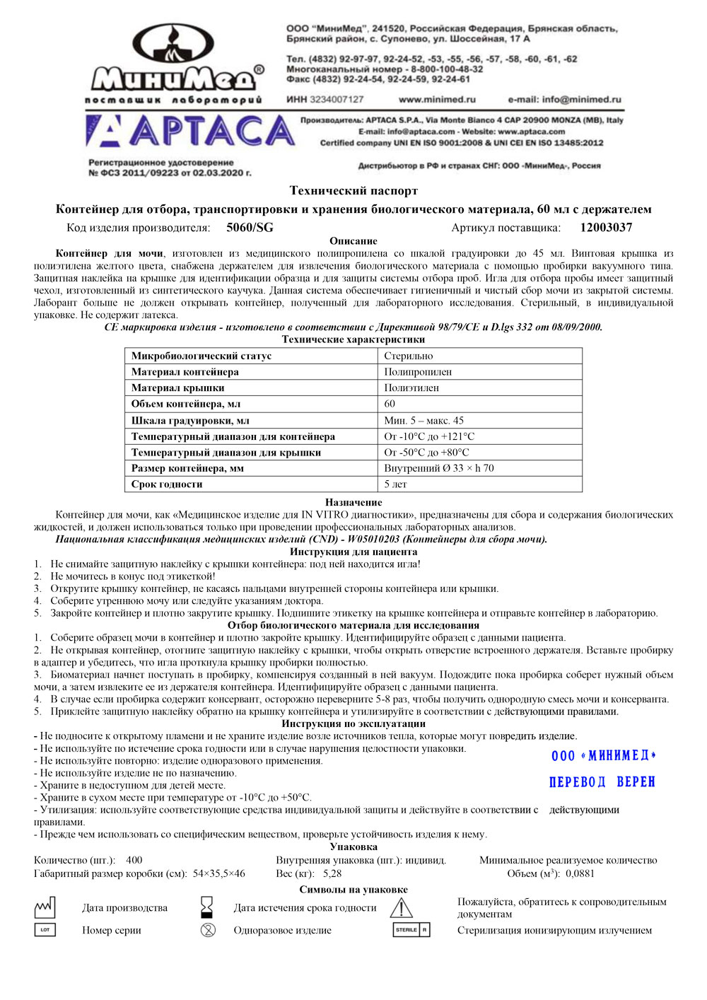 Обеспечивает полную герметичность при транспортировке биологического материала. Материал контейнера - полипропилен, крышки - полиэтилен. Винтовая крышка снабжена держателем для извлечения биоматериала с помощью пробирки вакуумного типа (арт. 12007052, 12007050), защитная наклейка на крышке для идентификации образца и для защиты системы отбора пробы. Игла для отбора пробы имеет защитный чехол, изготовленный из синтетического каучука. Данная система обеспечивает гигиенический сбор мочи. Имеет градуировку и матовое окошко для записи. Стерильный.