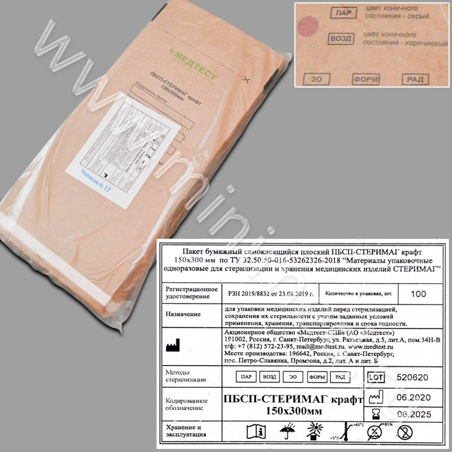 Пакет для паровой, воздушной, этиленоксидной стерилизации бумажный (крафт) самоклеящийся плоский ПБСП-СтериМаг 150*300, уп.100шт