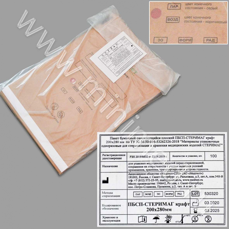 Пакет для паровой, воздушной, этиленоксидной стерилизации бумажный (крафт) самоклеящийся плоский ПБСП-СтериМаг 200*280, уп.100шт