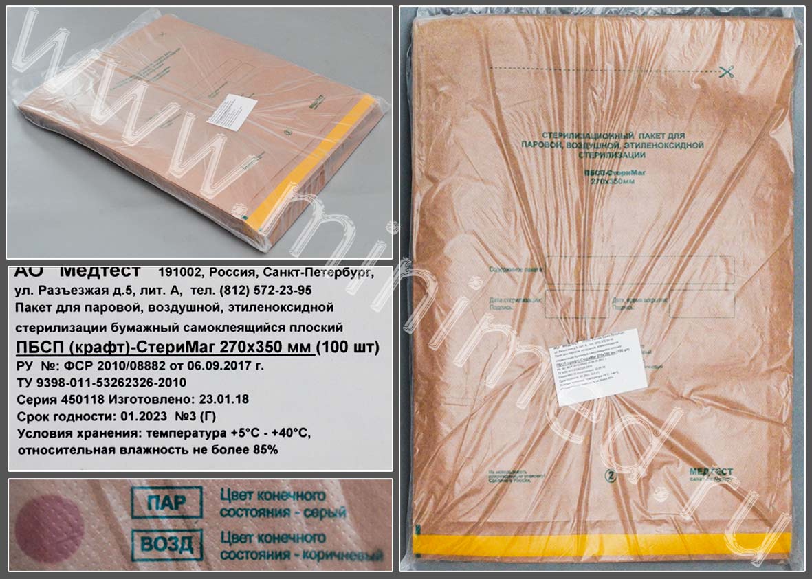 Пакет для паровой, воздушной, этиленоксидной стерилизации бумажный (крафт) самоклеящийся плоский ПБСП-СтериМаг 270*350, уп.100шт